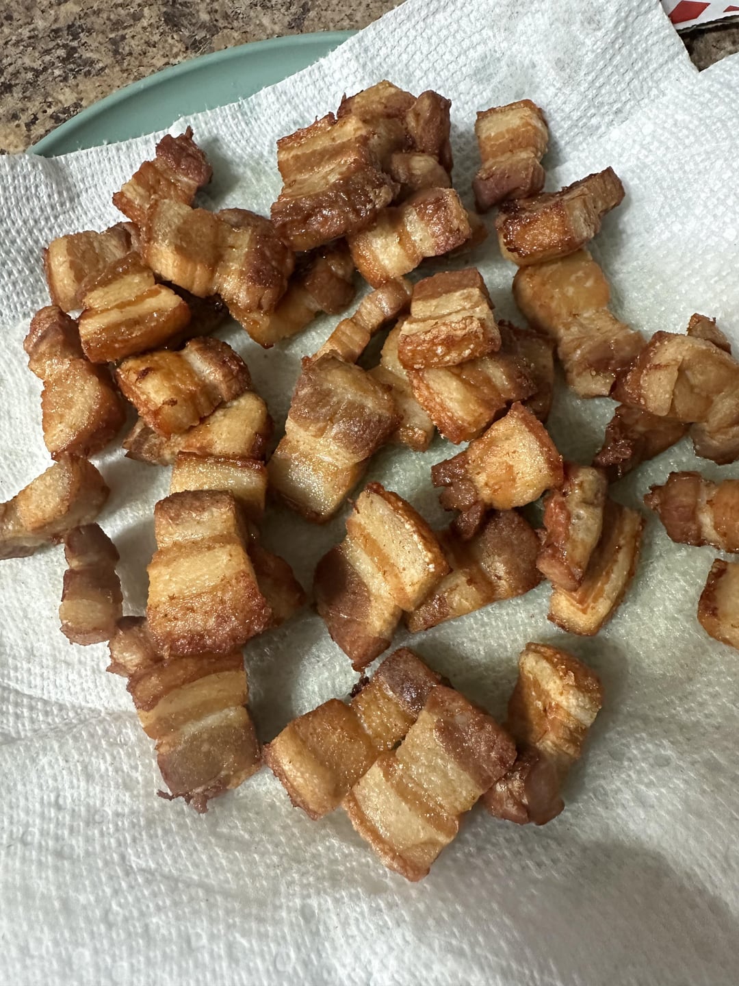After removing it from bags I put it on a plate and in the fridge for 24 hours. by iDoesun 7 Comments iDoesun 12 months ago Pat dry before fridge and Double fry to finish ~1.5 min total wooking 12 months ago Sweet bulgogi sauce? Or spicy friggintodd 12 months ago Is side belly just another name for pork belly or is it a different cut or location? I assume you cooked it whole and then diced it up? HalcyonDias 12 months ago As your cardiologist, we need to chat… FocusIsFragile 12 months ago Filth! (I want some) PeacoPeaco 12 months ago Is the skin crispy? mrboomtastic3 12 months ago Fry.Write A CommentYou must be logged in to post a comment.