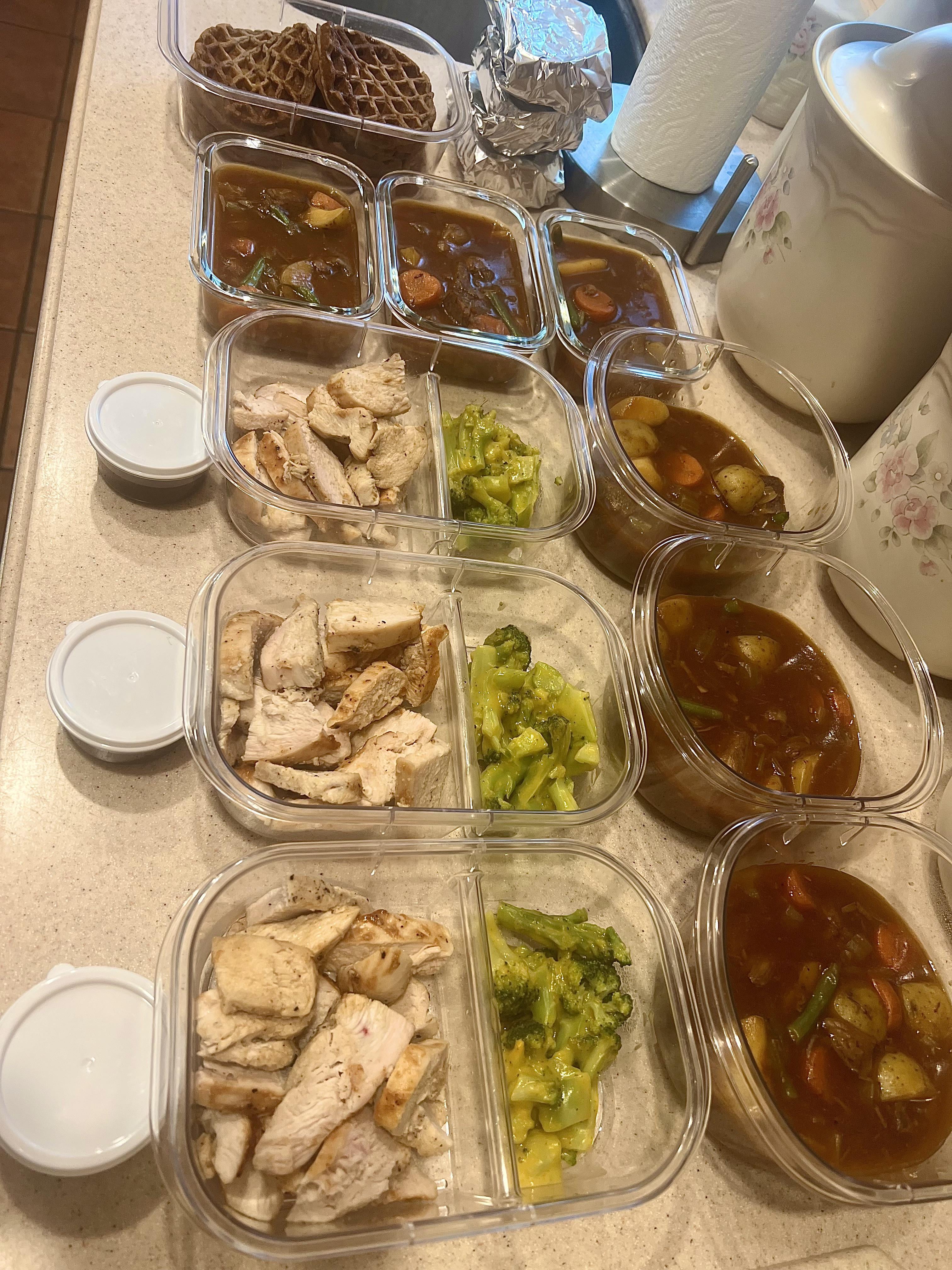 Boiled beef stock in a pot, added veggies + potatoes, removed fat and sliced up the pot roast and added to the pot. Seasoned and let simmer until I was done making everything else. Also used some corn starch in water and added that until it was thickened. I always weigh my solid food into the containers before adding the liquid to ensure every serving is about the same!