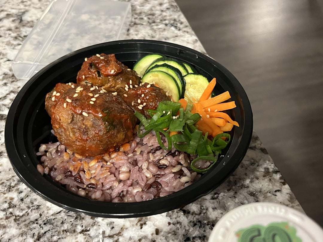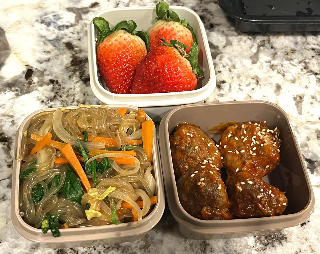 Japchae and gochujang meatballs- this was my lunch box, same meatballs as my dad’s, but with garlic. Japchae was just with whatever was in my fridge (carrots, cabbage, onion, and spinach).