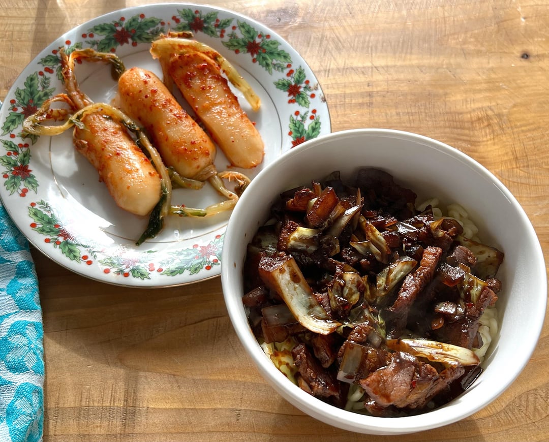 Jjajangmyeon with chonggak kimchi- I made my own sauce, with cabbage, onions, and pork belly, but using ramen noodles. Paired perfectly with the kimchi.
