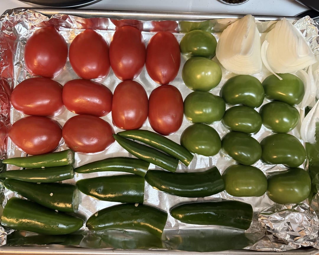 Green: 6 tomatillos, 1 tomato, 1 jalapeño, 2 serrano, 2 arbol chiles, 3 cloves garlic, 1/2 white onion, juice from the pan after roasting, cilantro, lime juice, bouillon powder, salt, and pepper