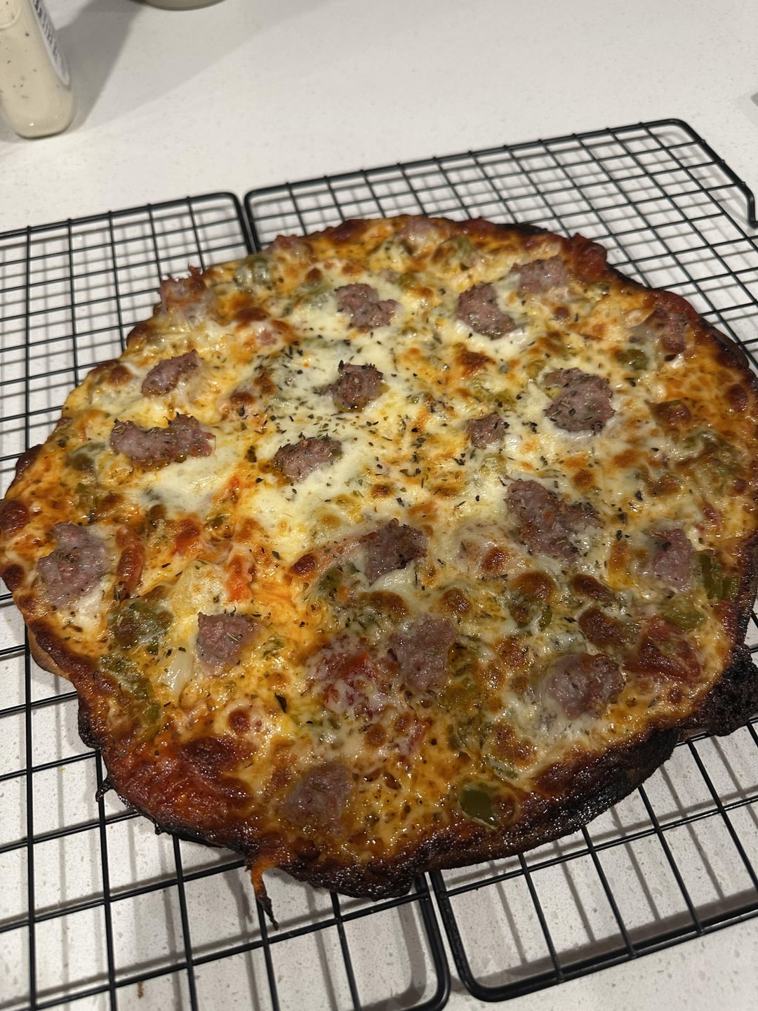 When I came across Kenji’s tavern style recipe I had to give it a go and holy shit, it’s so damn good. I started the dough Friday night so it only went 24 hours in the fridge, then about 24 hours rolled out on the countertop. It came out thin, crispy and delicious.
