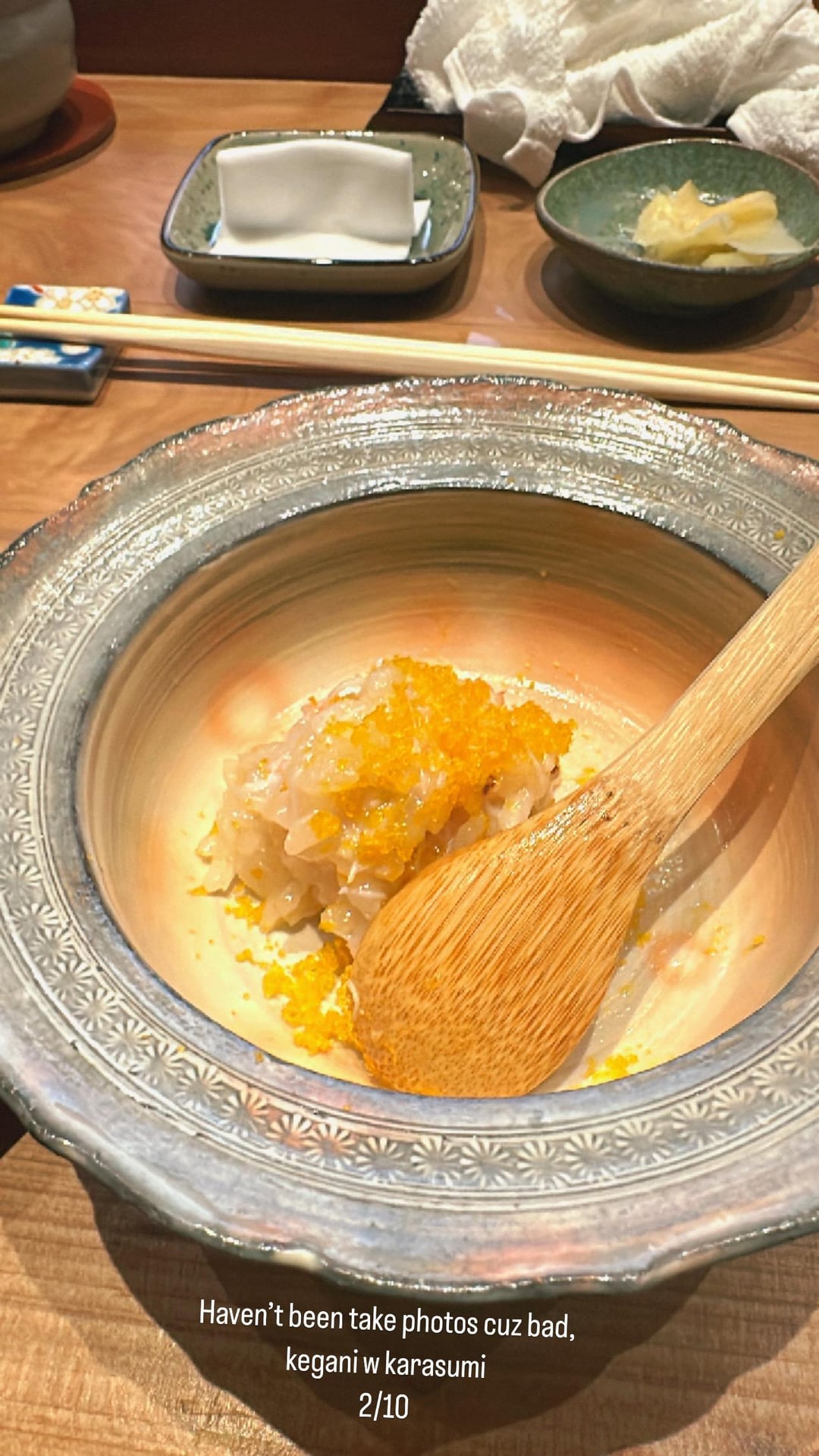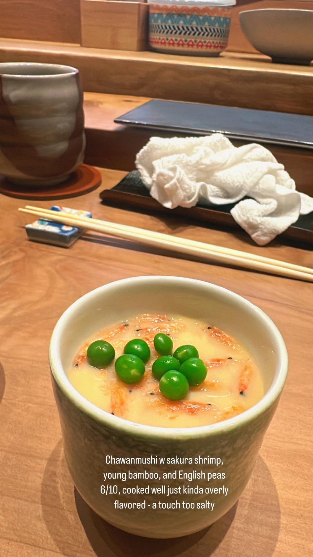 2. appetizers that mostly miss on a cooking + seasoning basis (hard/partially uncooked rice in kegani risotto – the rice wasn’t al denté, it was genuinely undercooked and seasoning things that I admit are more subjective – bland/unseasoned kindmedai but overseasoned/salty Chawanmushi)