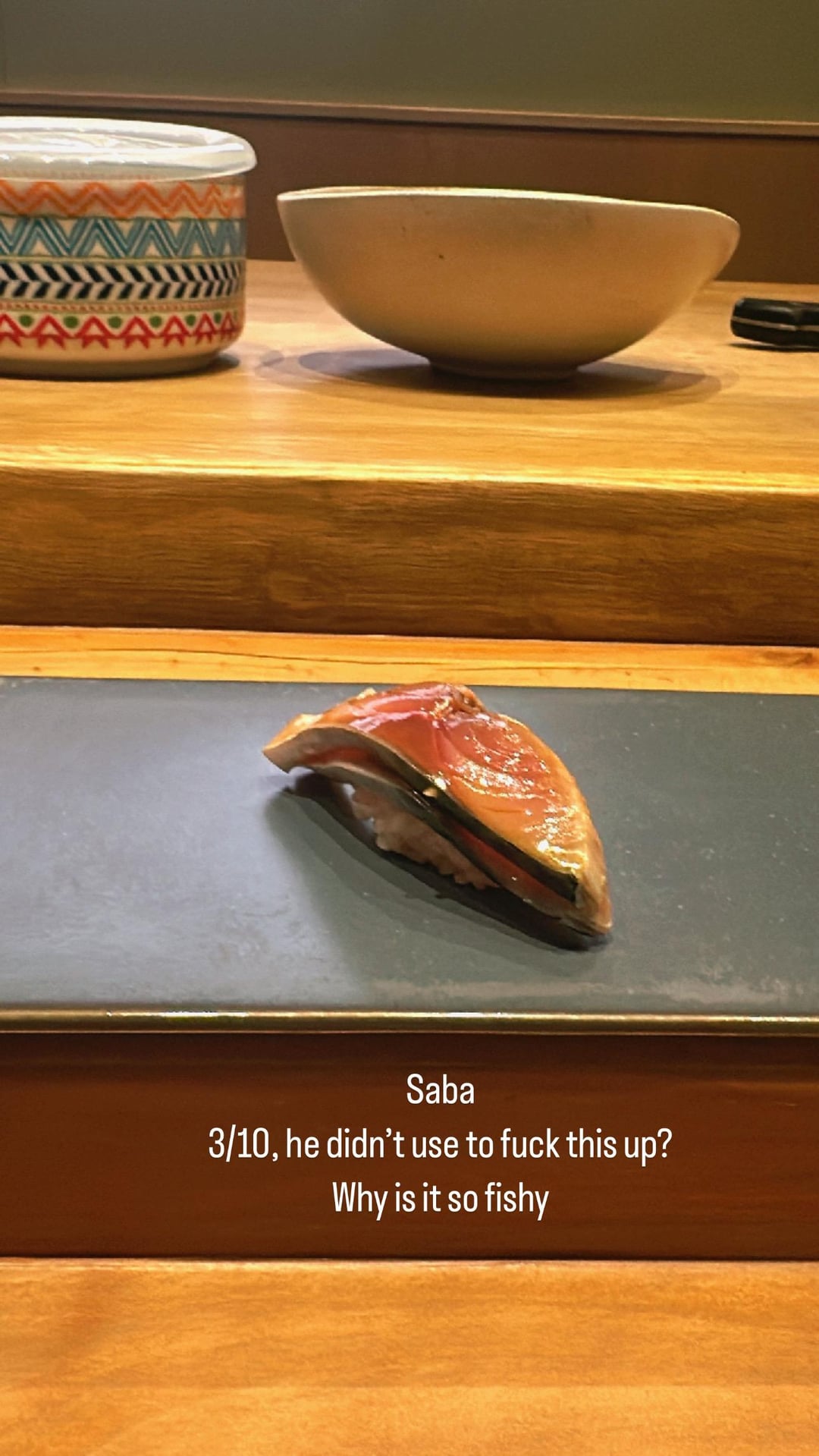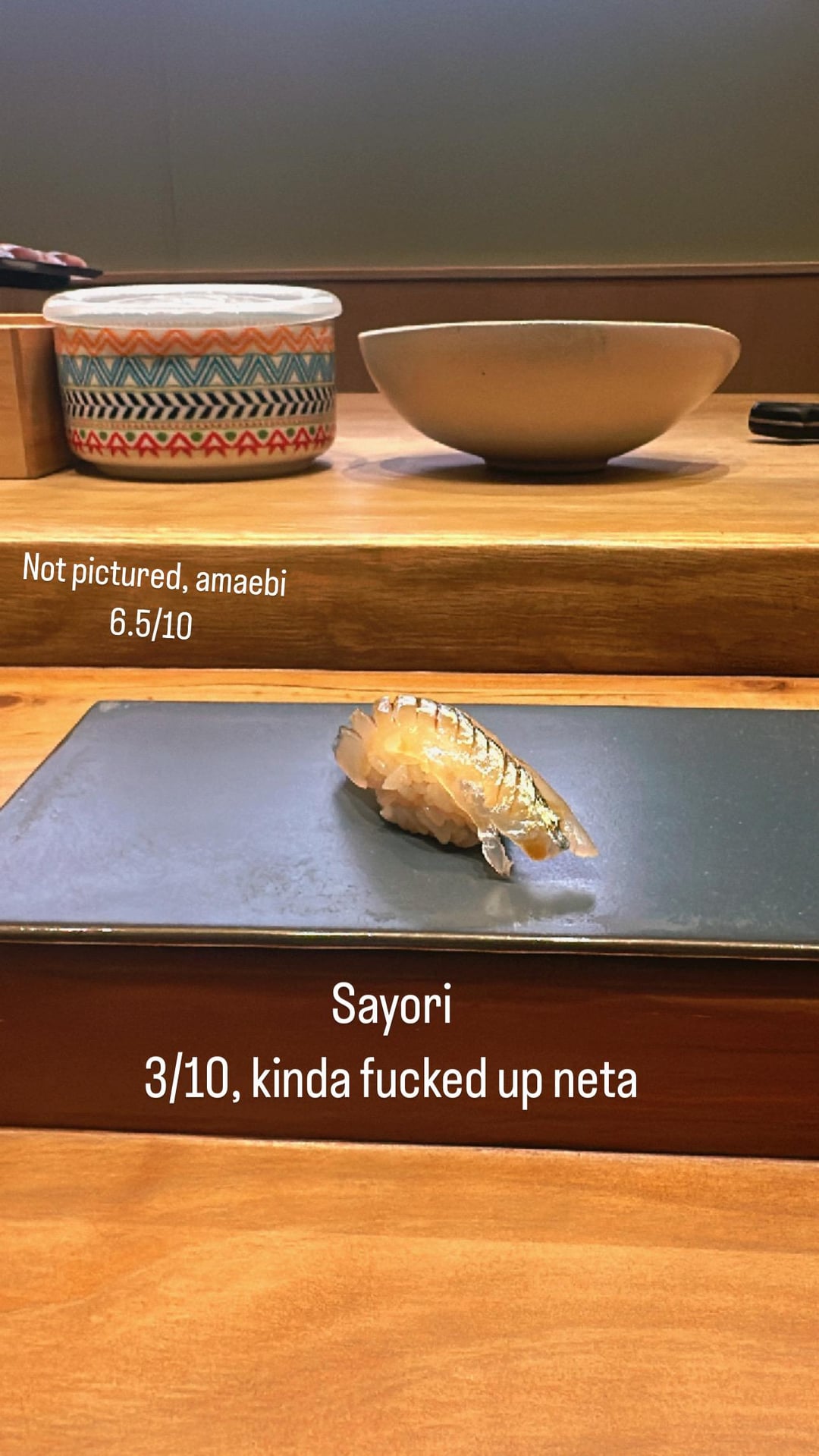 1. dry/cold shari, sloppily cut and prepped neta (numerous pieces like the sayori and the katsuo I was served were mangled by high end sushi standards)
