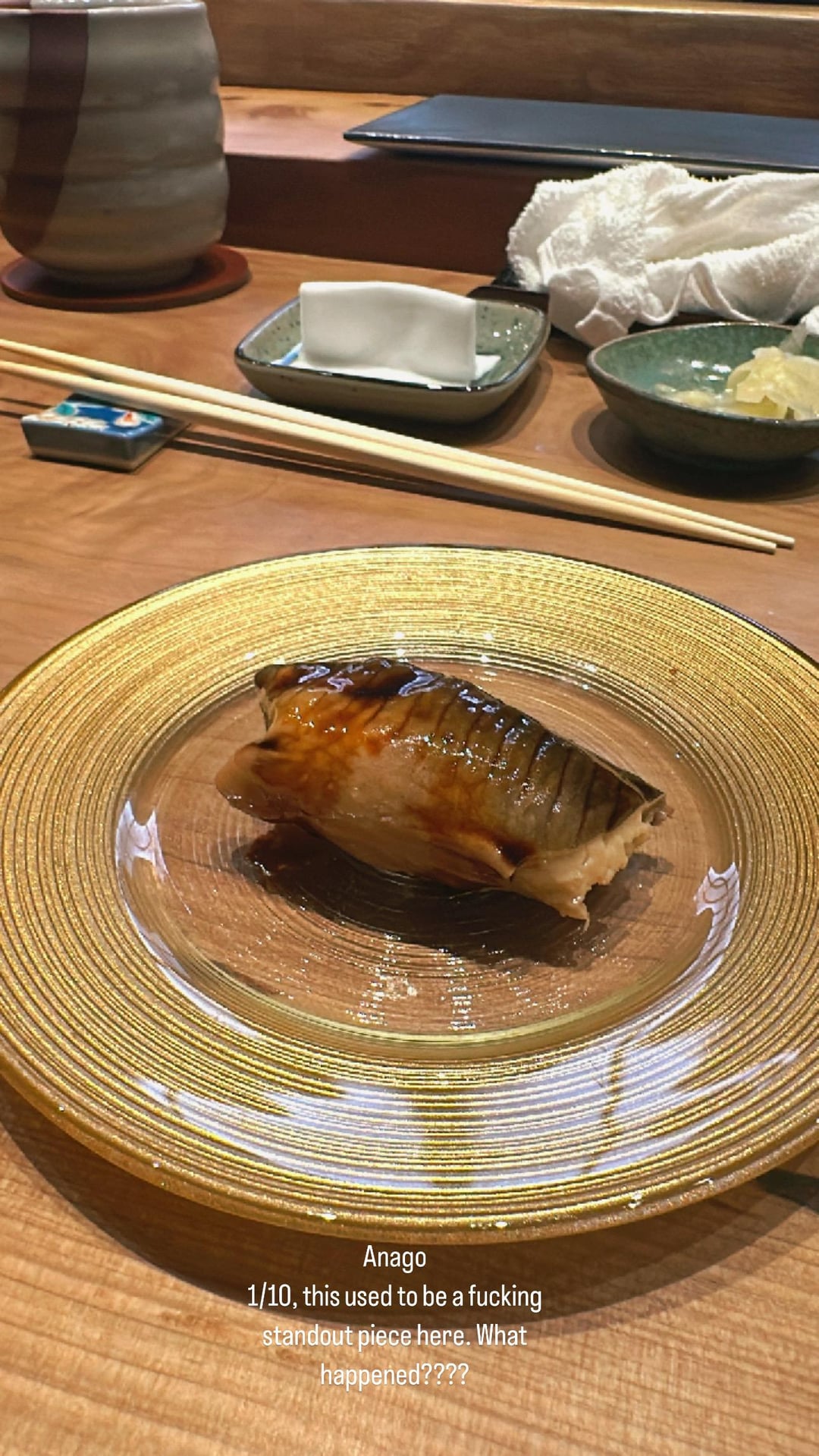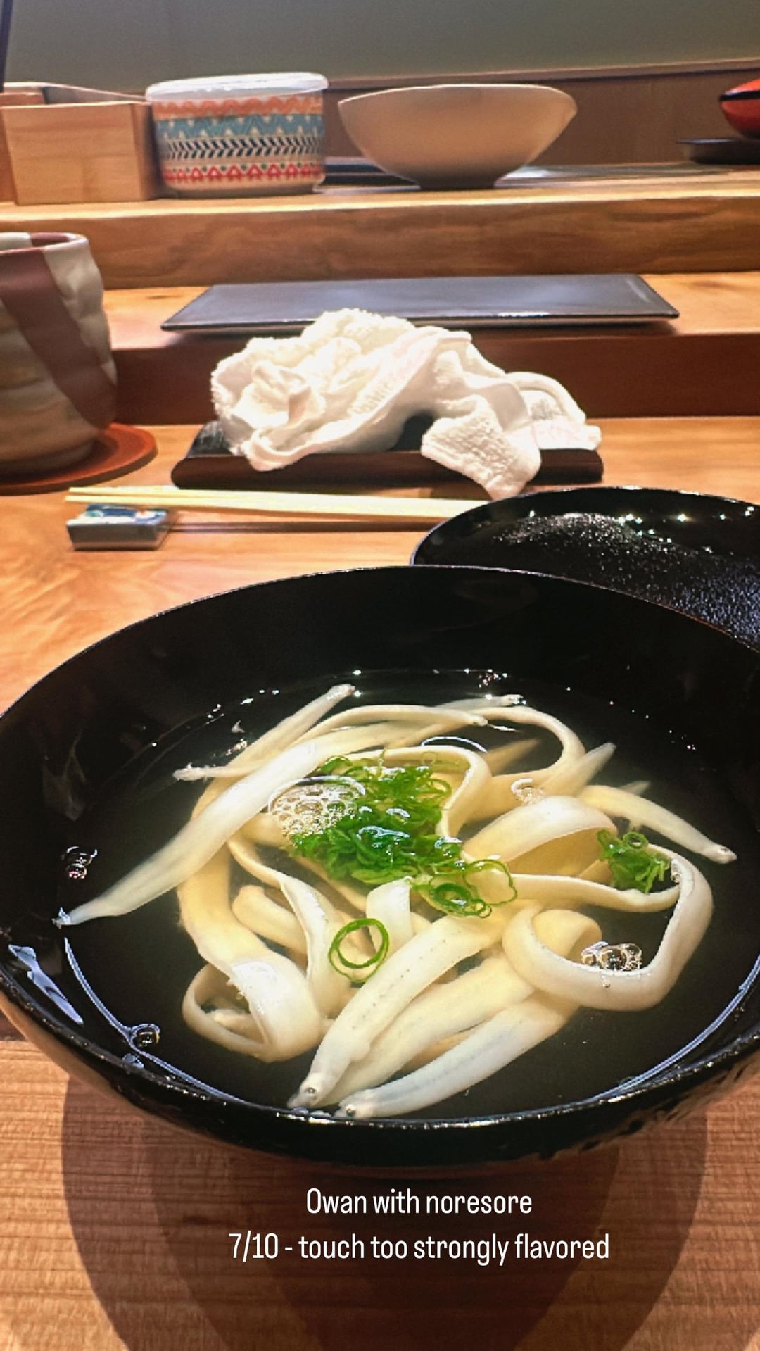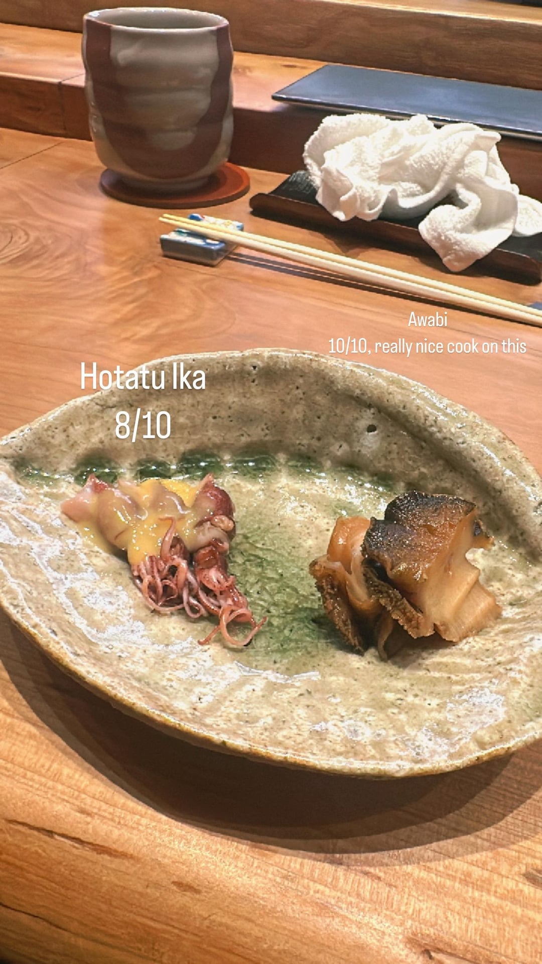 It may have been an off night though – there were bright spots, the awabi appetizer was basically perfect and the ankimo was also done well in both preparations.