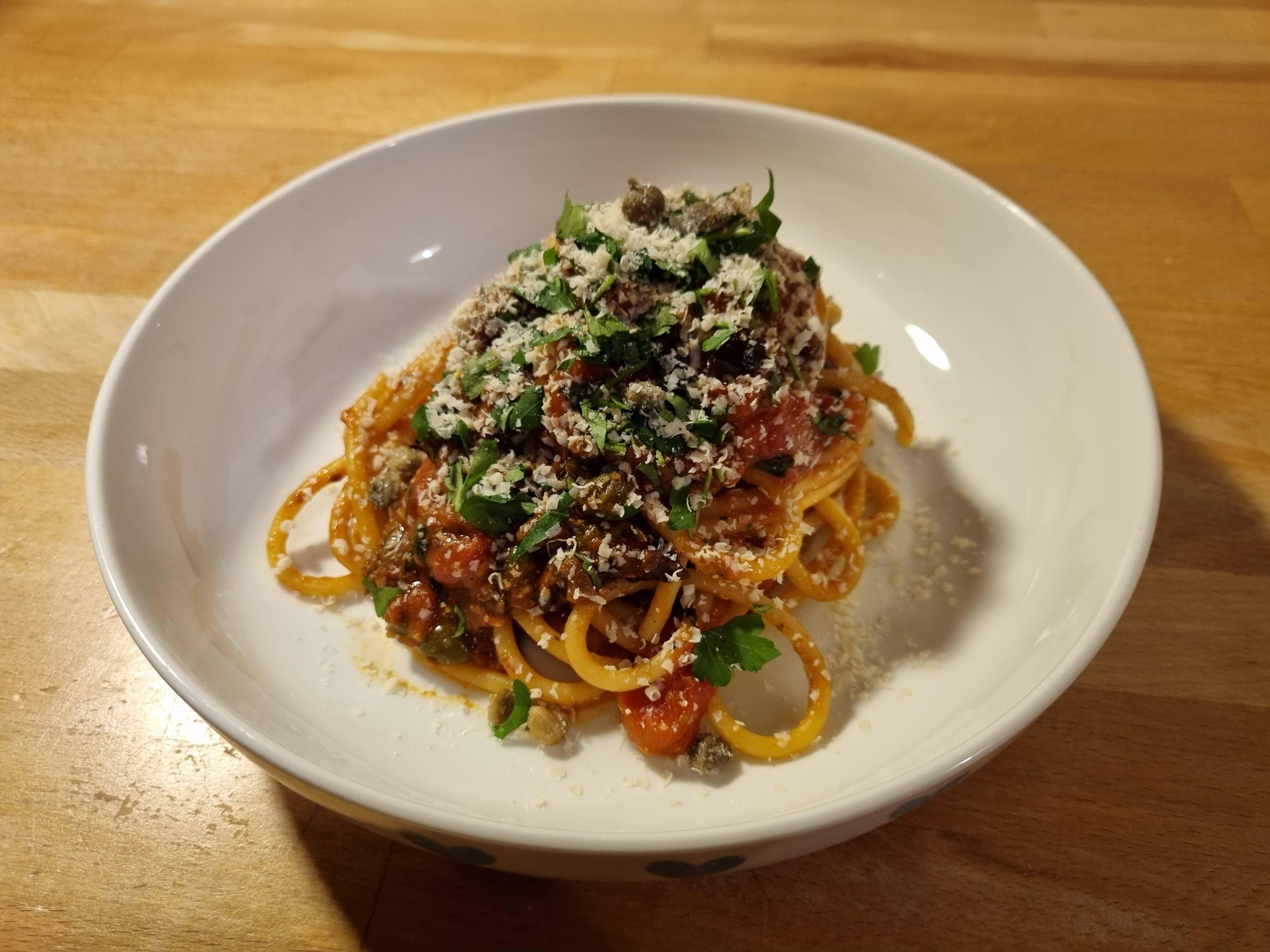 * 200g Bucatini * 2-3 Anchovy Fillets (depends on the saltiness of the Anchovies) * 1/2 – 1 teaspoons of Chilli Flakes * 2-4 Garlic Cloves * Small bunch of Parsley, leaves picked, stalks kept. * 1-2 Tablespoon Extra Virgin Olive Oil * 1-2 tablespoons Capers * 10-15 Kalamata Olives * 1 tin of whole, peeled San Marzano Tomatoes * Parmigiano Reggiano/Pecorino Romano/Ricotta ~~In~~salata * 1 Tablespoon of Salted Capers (optional)