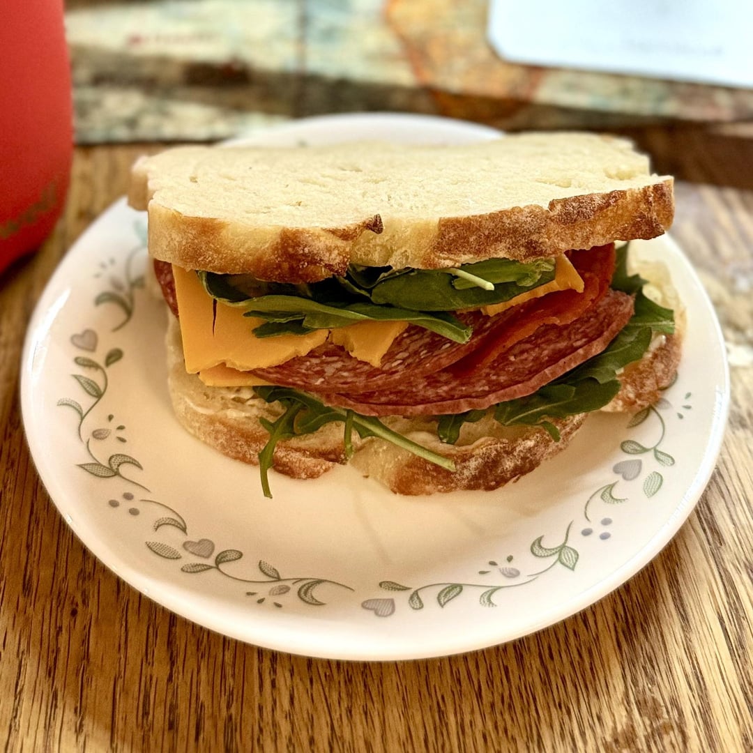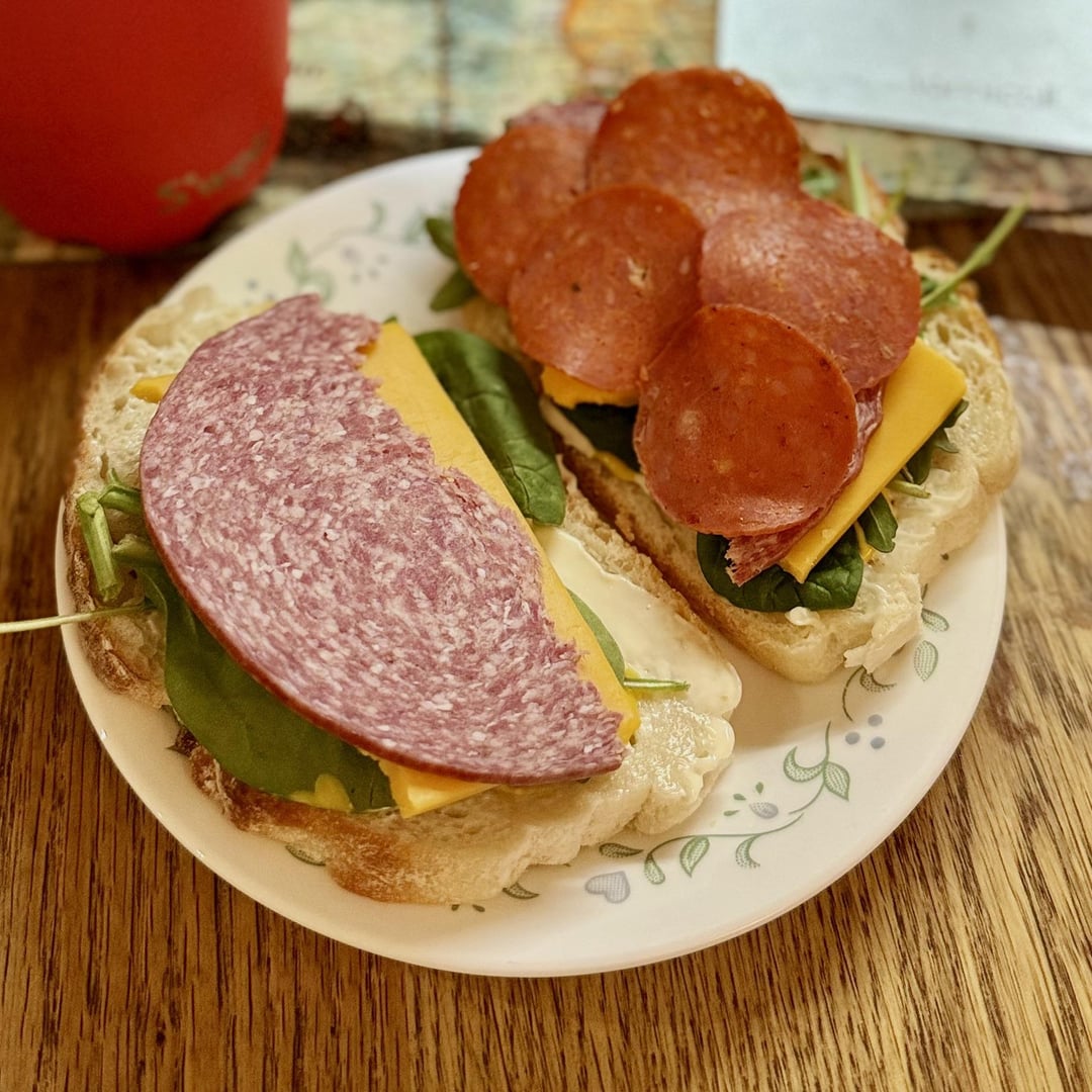(1) Lebanese Bologna and Turkey Pepperoni with cheddar cheese, spinach and arugula, mayonnaise and mustard and (2) Roast Turkey and Turkey Pepperoni with cheddar cheese, spinach and arugula, mayonnaise and mustard