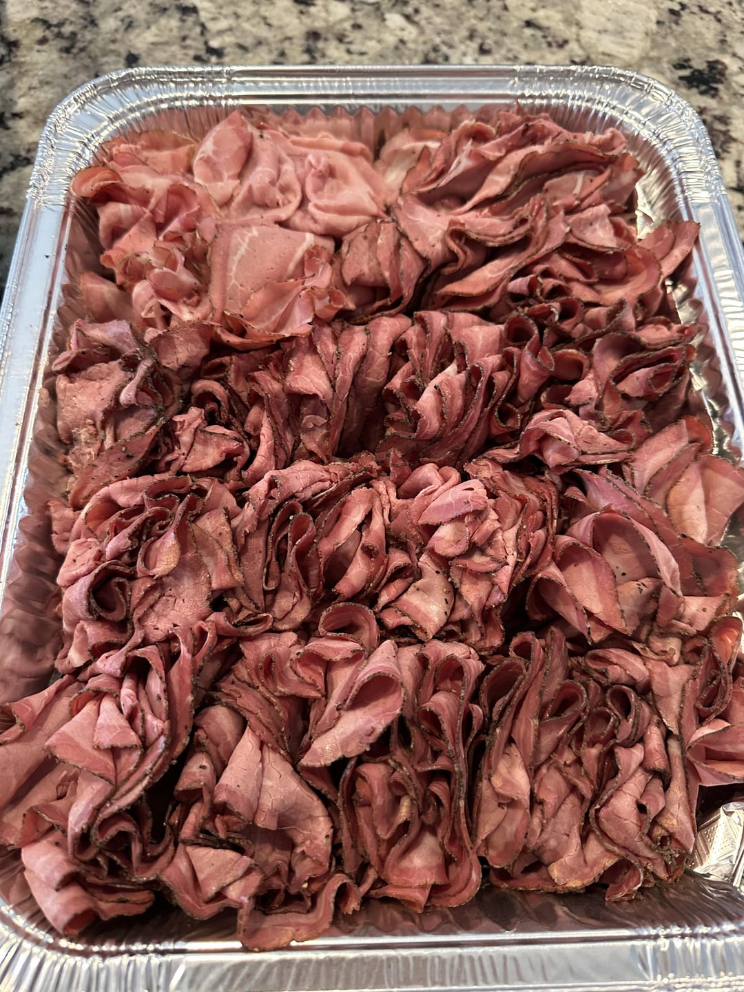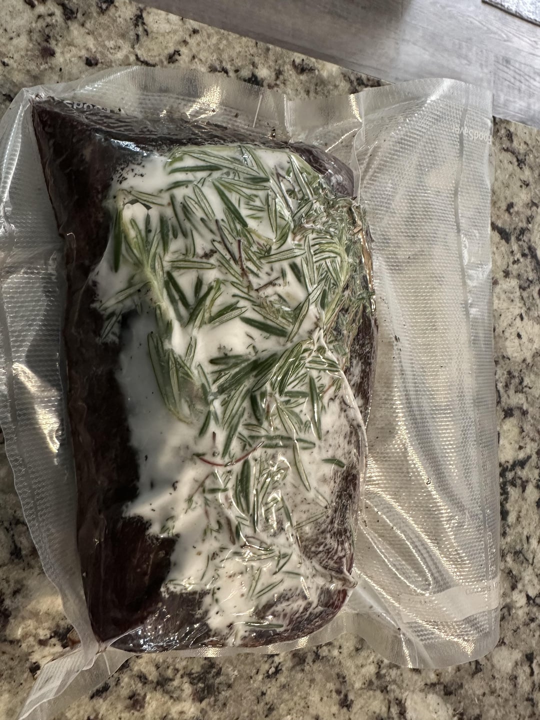 SPG seasoned eye of round, smoked 2 hours @ 150, sealed with rosemary, thyme and a dollop of Wagyu tallow before a 30 hour sous vide bath @ 133. Sliced thin.