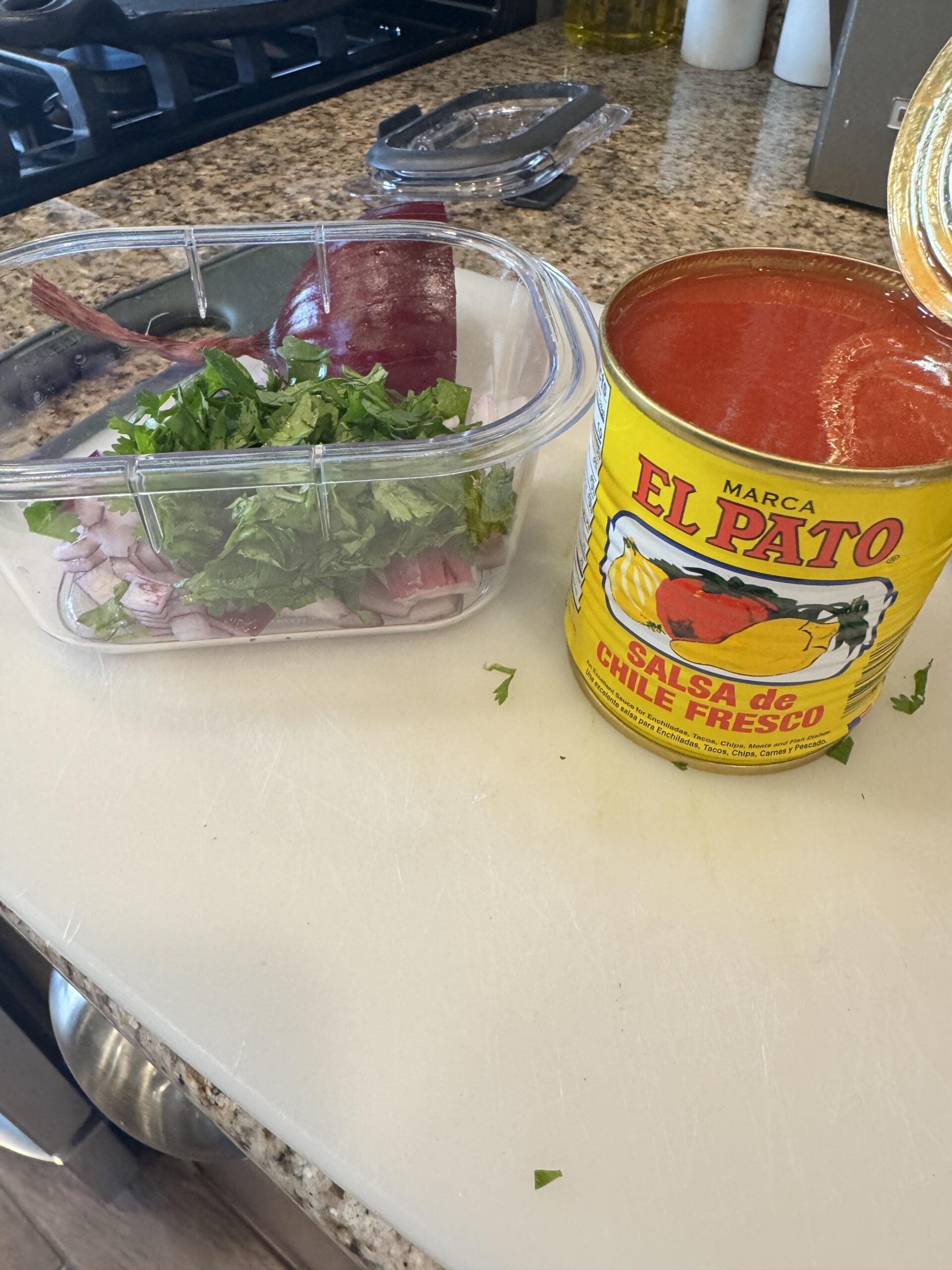 Im definitely about El pato. I actually mic a can of rotel fire roasted tomatoes. I hit it with the handheld blender. Then I add cilantro, onion and just a touch of oregano and salt..