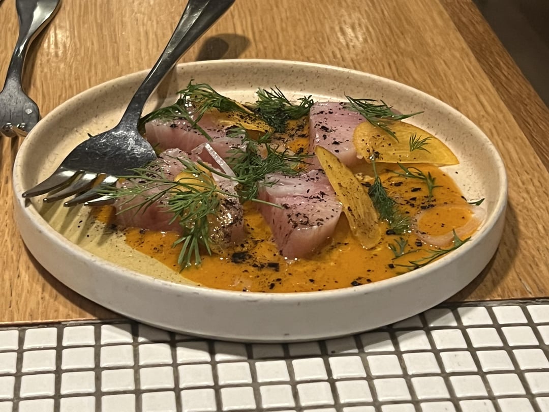 First course: Hamachi Crudo. Delicious fish that balances well with the persimmon sweetness and the heat from the fermented chili. Sauce was absolutely fantastic, with a nice spiciness at the end.