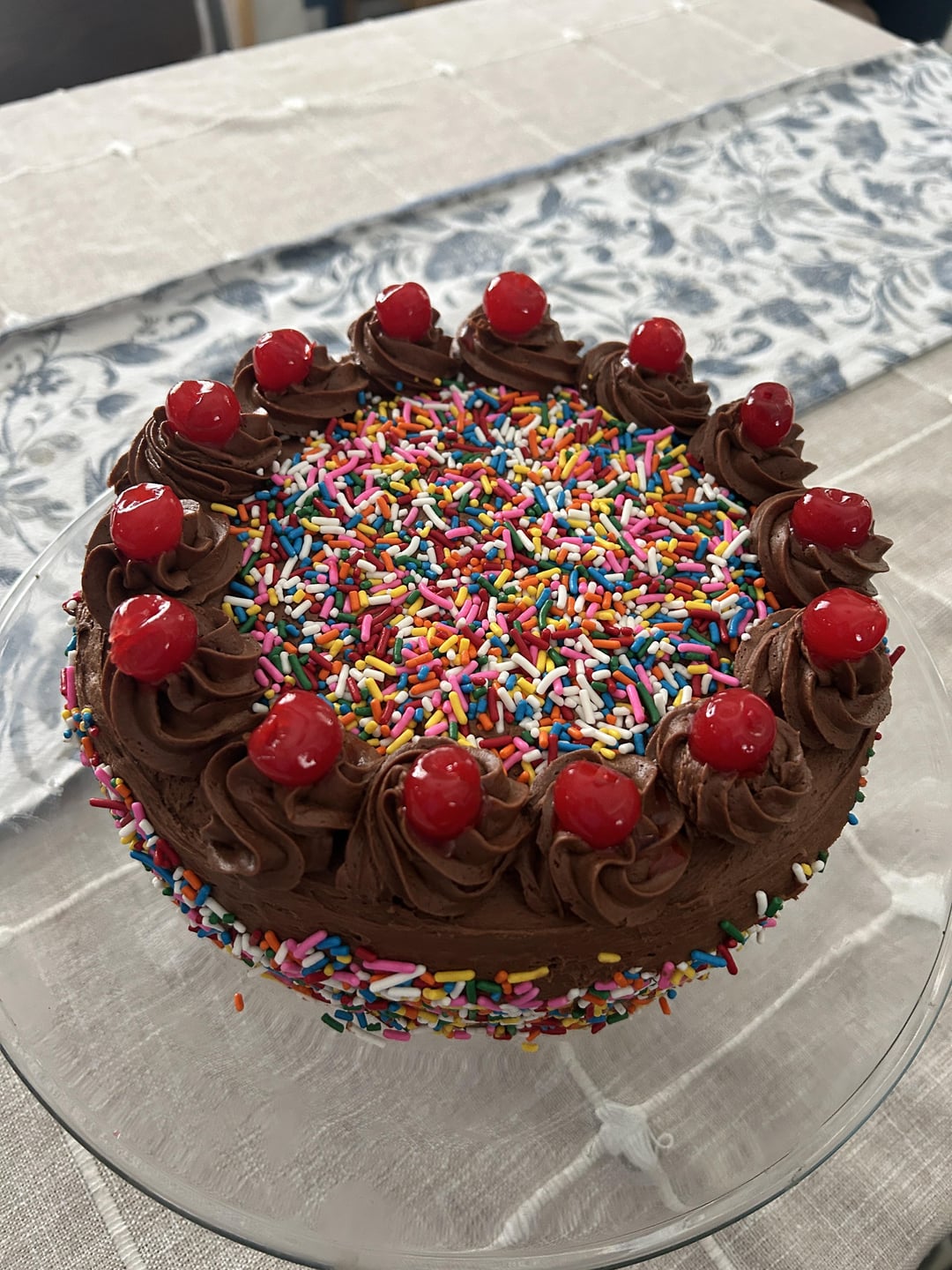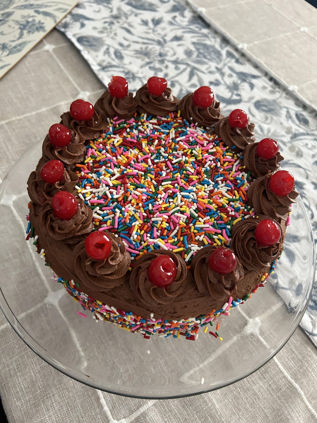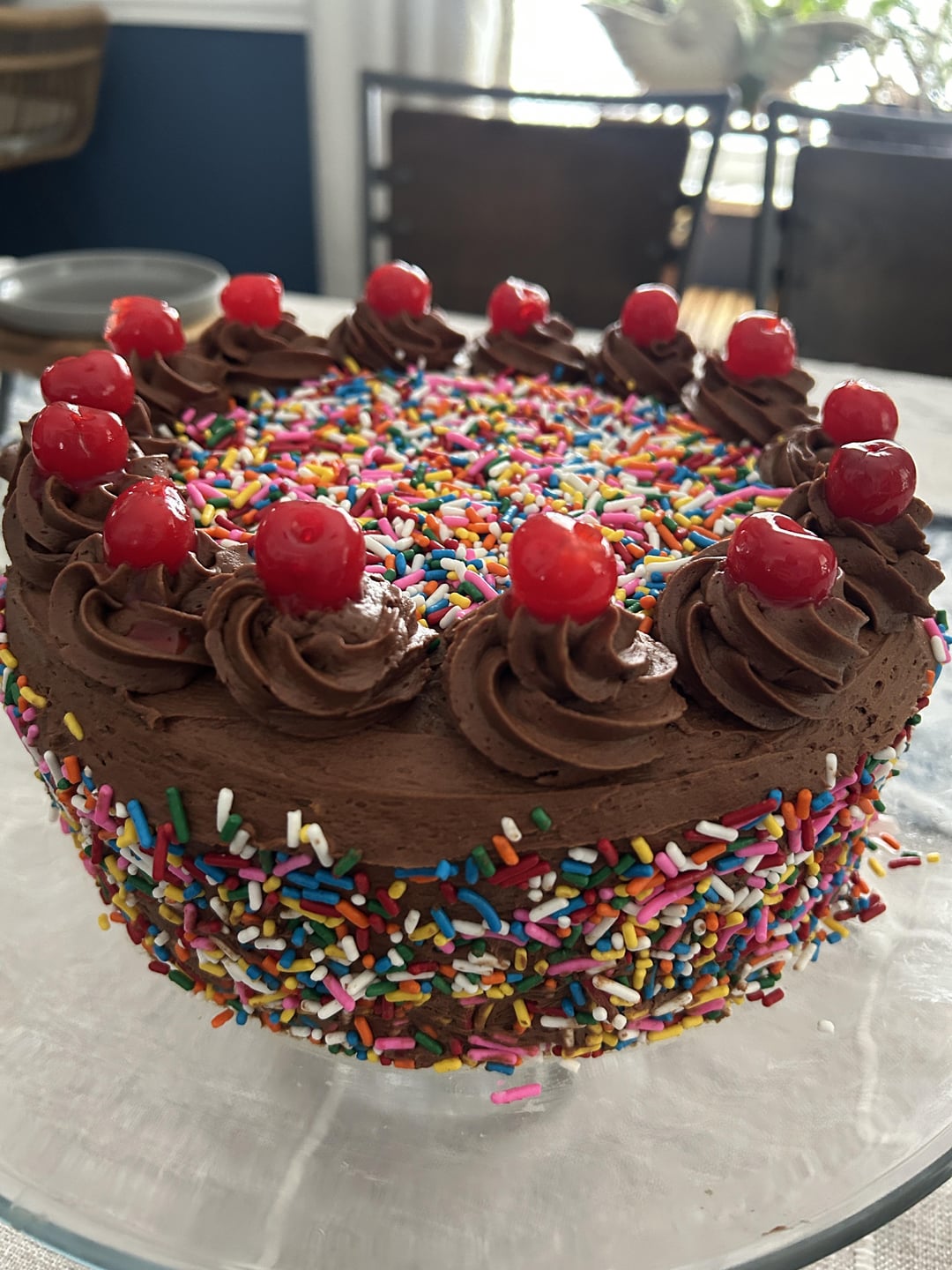 I made this yellow cake and chocolate frosting recipe from Sally’s Baking Addiction! I added jimmies (rainbow sprinkles) to the batter and around the cake + maraschino cherries on top! It was so good. I linked the recipe in the comments!