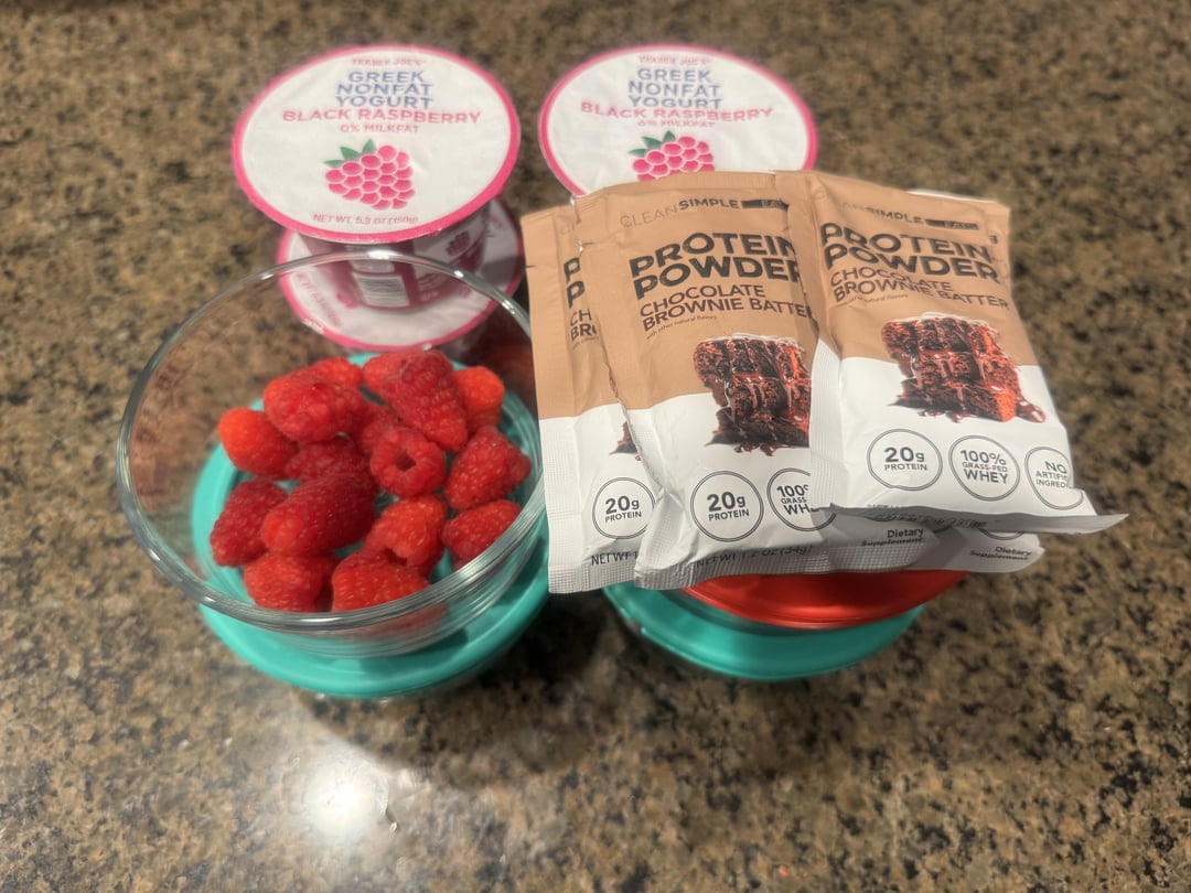Raspberry Yogurt (raspberry Greek yogurt, fresh raspberries, chocolate protein powder – 280 calories, 34g protein)