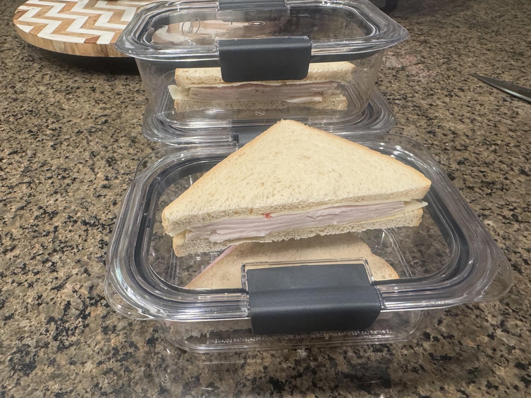 Turkey Sandwich and Veggies (keto bread, Dijon mustard, thin sliced pepper jack, sliced turkey + broccoli, cauliflower, carrots, cucumber, sugar snap peas, grape tomatoes, mini sweet peppers + green goddess dressing, nonfat Greek yogurt – 285 calories, 28g protein)
