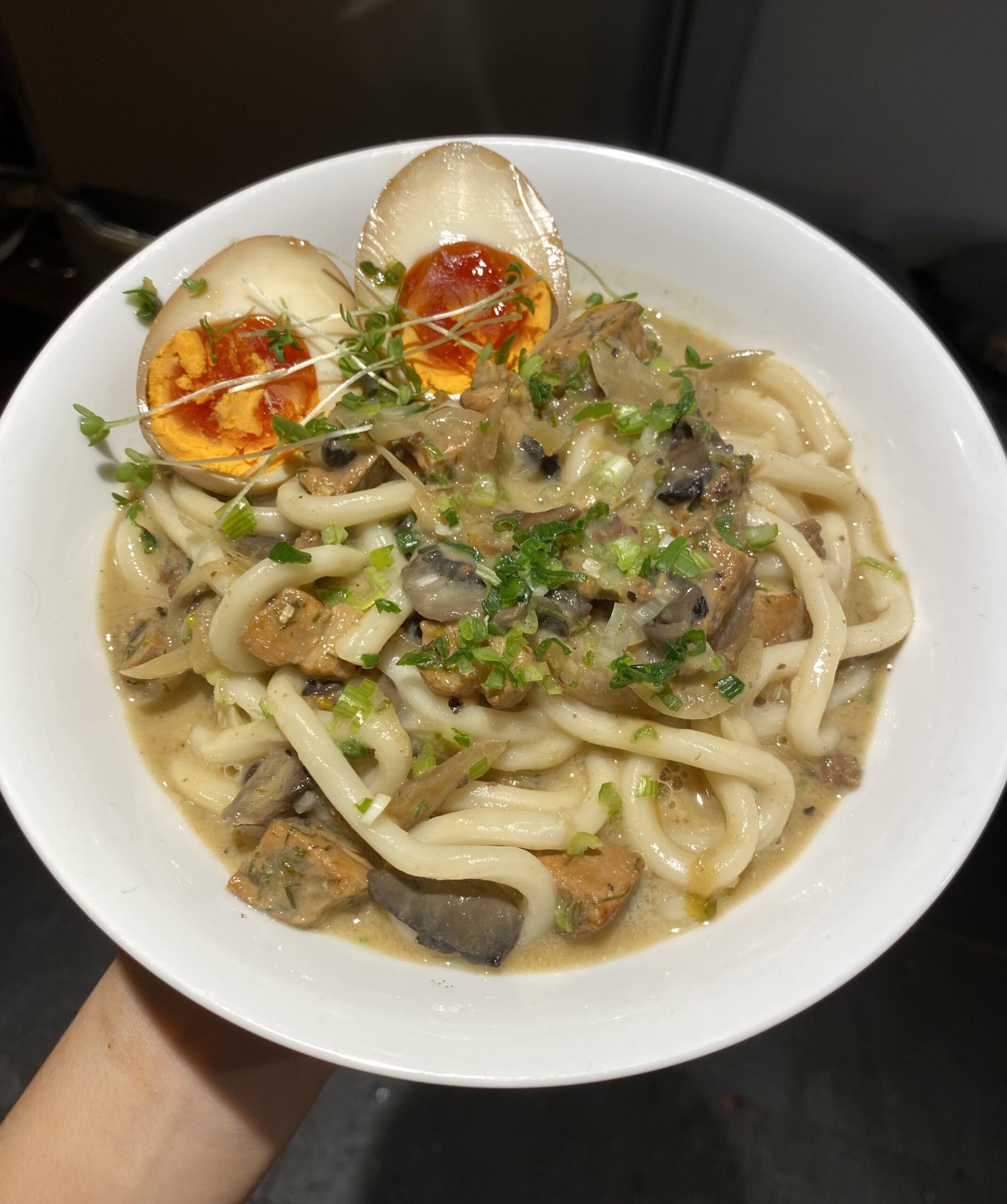 Creamy mushroom udon topped with radioactive looking ramen eggs by euphoriclamb Write A CommentYou must be logged in to post a comment.