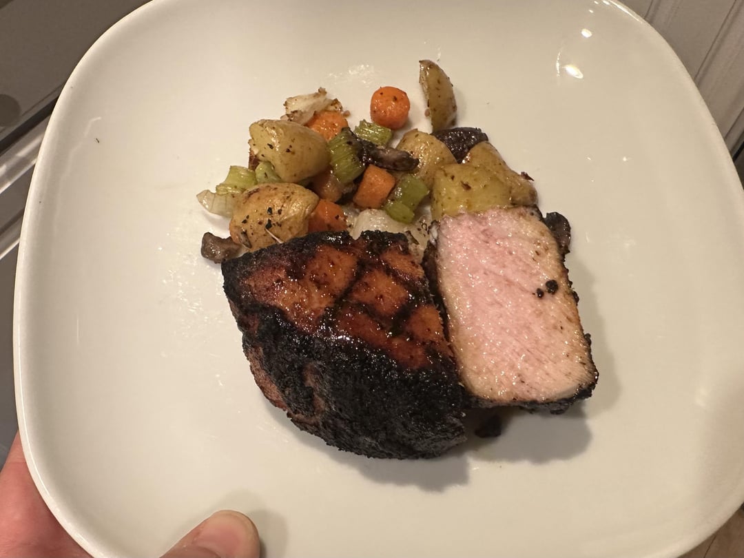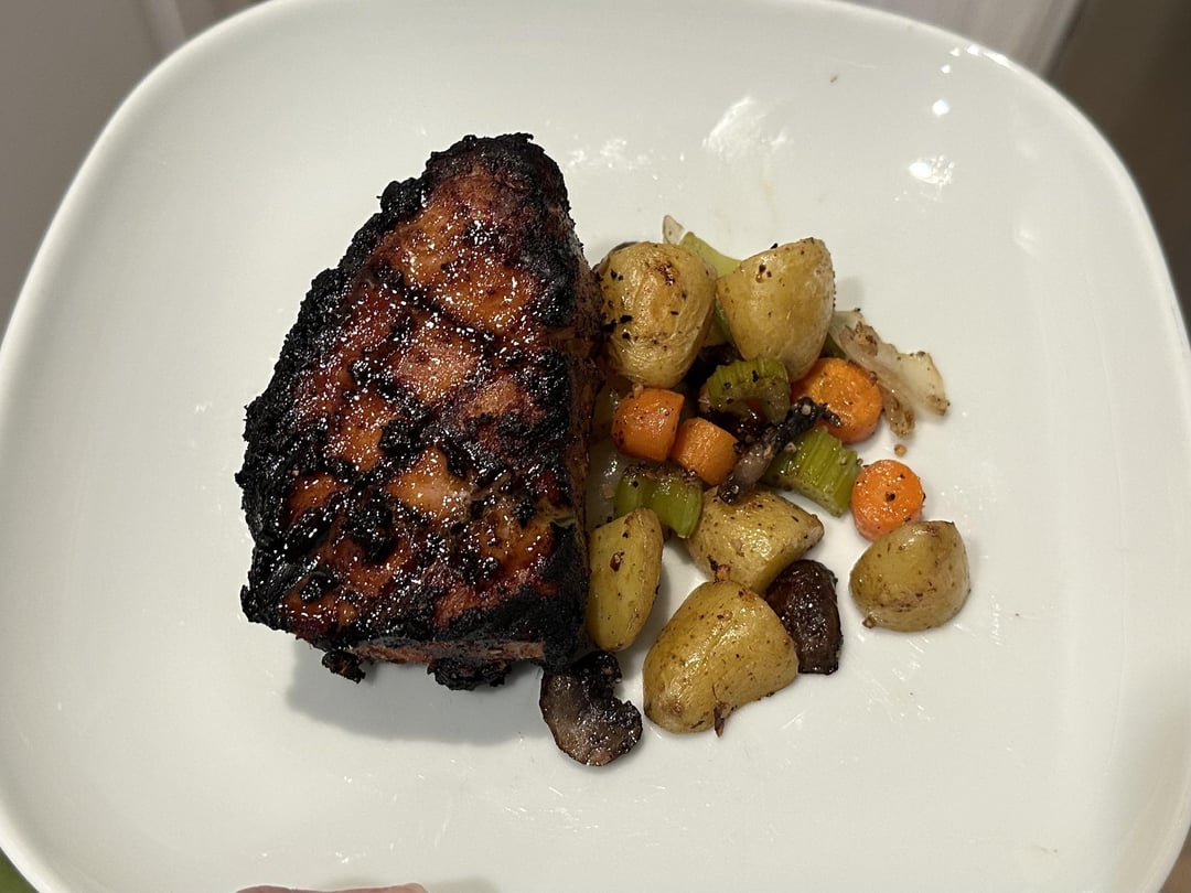 Dry brined, chili oiled, and Memphis dust rubbed. Forward seared and then hickory smoked. Pulled at 130ish (YOLO). That burnt fat was like candied bacon. No left overs. Also did a quick oven hash side (potatoes, celery, carrots, and onion with EVOO and SPG)