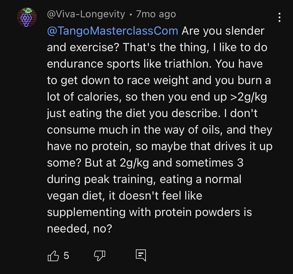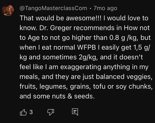 Tbh I don’t. I am not sure how much of a problem it is/will be. I struggle to get 1g per kg and am often under. I eat almost exclusively whole grains, legumes, and nuts & seeds daily including soy & soymilk (+ fruit & veggies). Pasta, which I often have for dinner with my kids, bumps my protein up because it’s fortified. I’m not a huge fan of the processed faux meat or seitan which I know would help raise it. I do like TVP but I don’t eat that every day. Maybe once a week. I am not interested in using protein powder. I exercise and am in good shape and lift weights, do balance work, jump rope. I’m not trying to grow big muscles, as long as I feel strong and am able to do what I want to do, I’m not sure how it’s harmful to get less than that recommended amount of protein. I seem to meet all of my other nutrient targets. Calcium is the only other one that I’m lower on but I hit the WHO recommendation just not USDA.