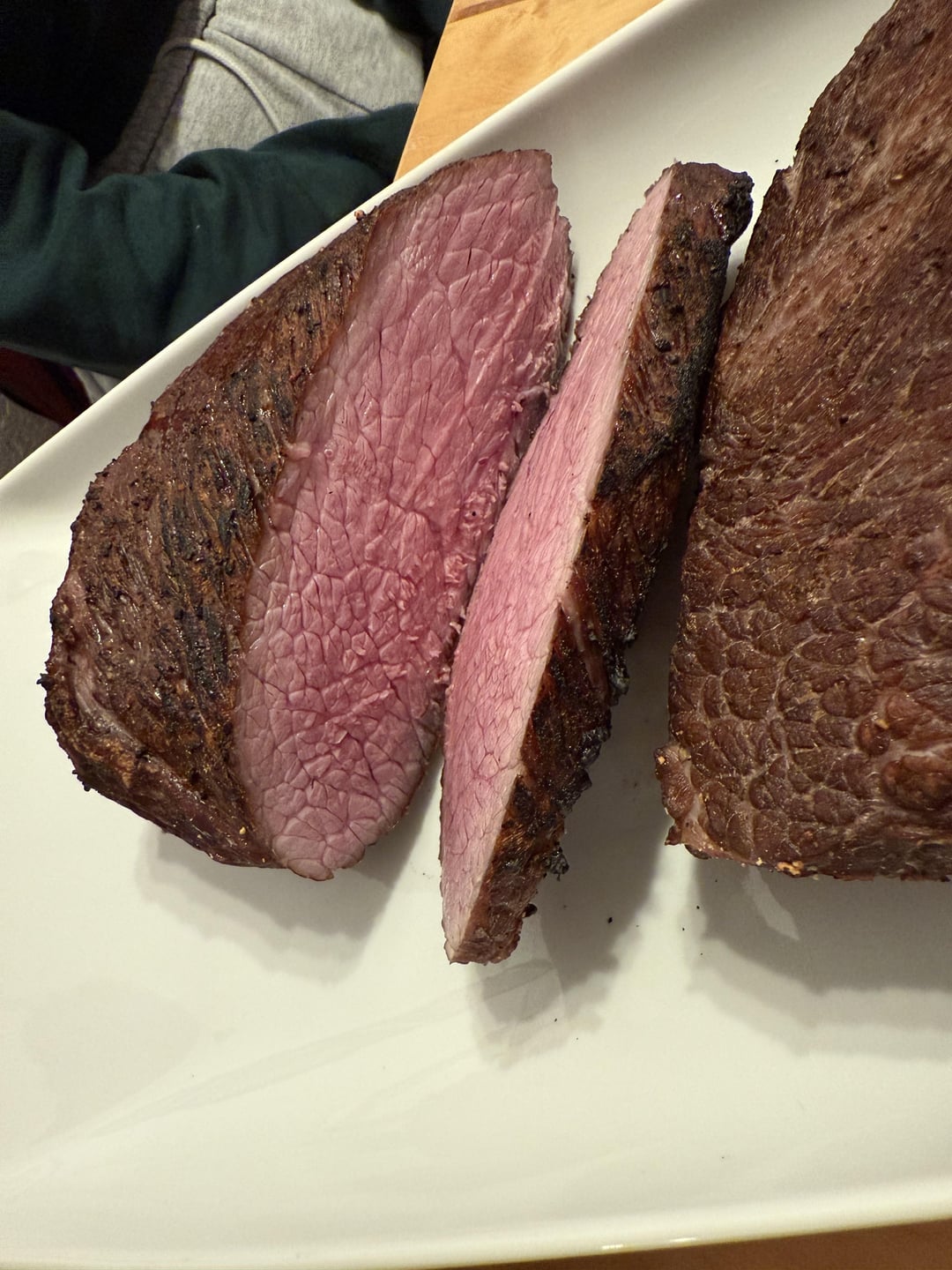 137f for 6h. Seasoned with Salt, Pepper and Garlic. Finished with my Beefer. Sadly didn‘t taste that good.