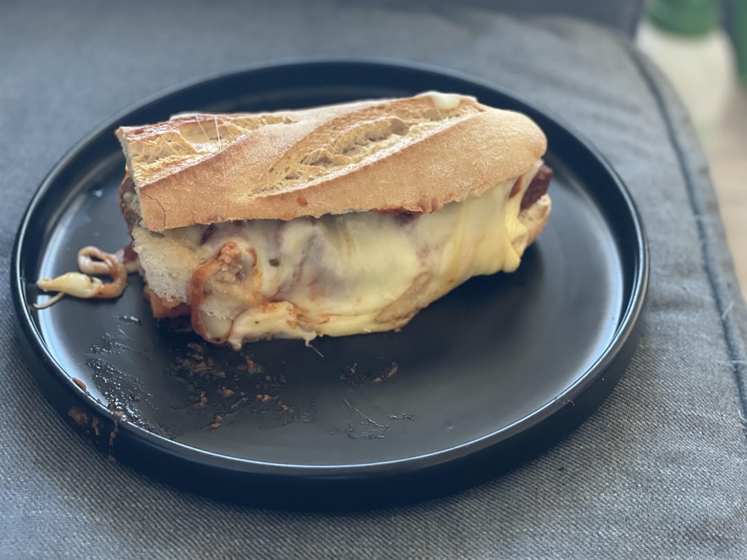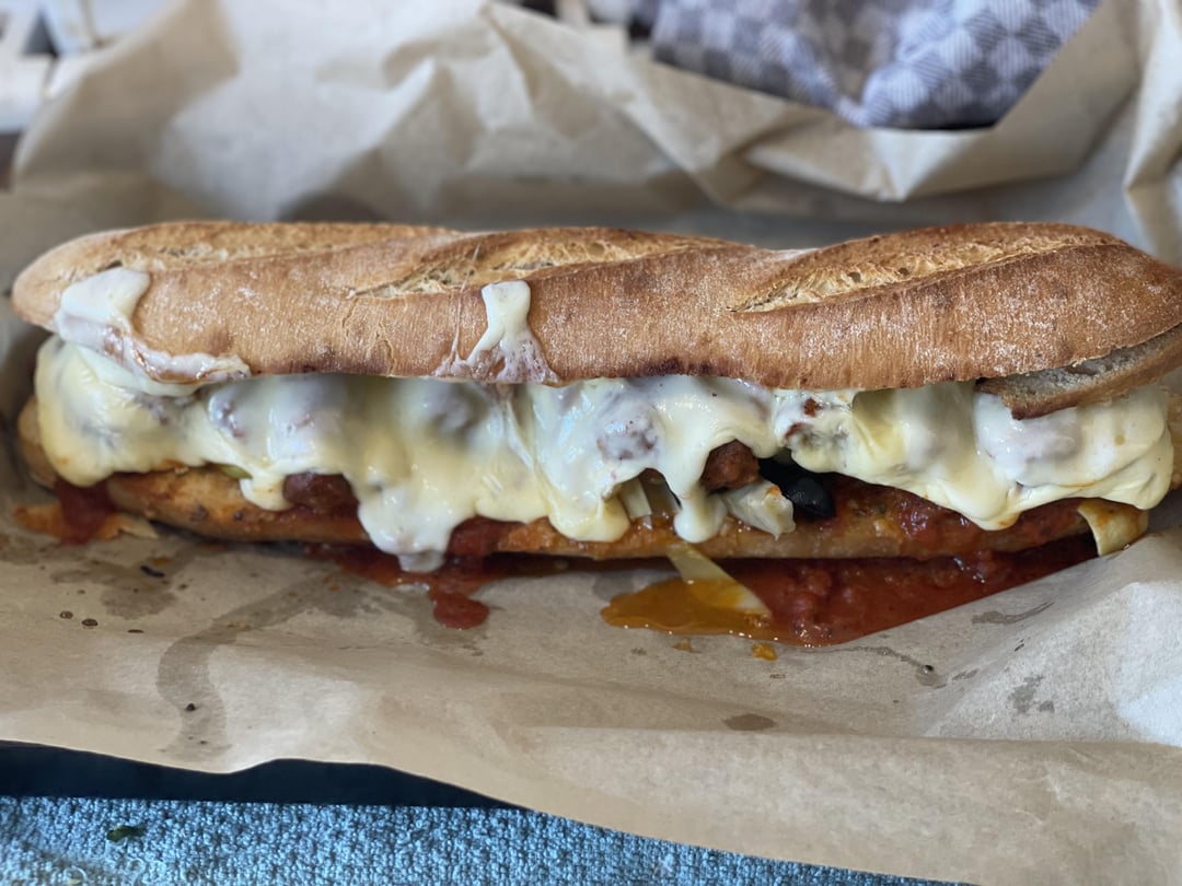 Got it into our heads to split a giant meatball sub for lunch today. Frozen meatballs, marinara sauce, on French baguette made into garlic bread. Pepperonchinis (sp?) on the whole thing. Added black olives and artichoke hearts to my side.