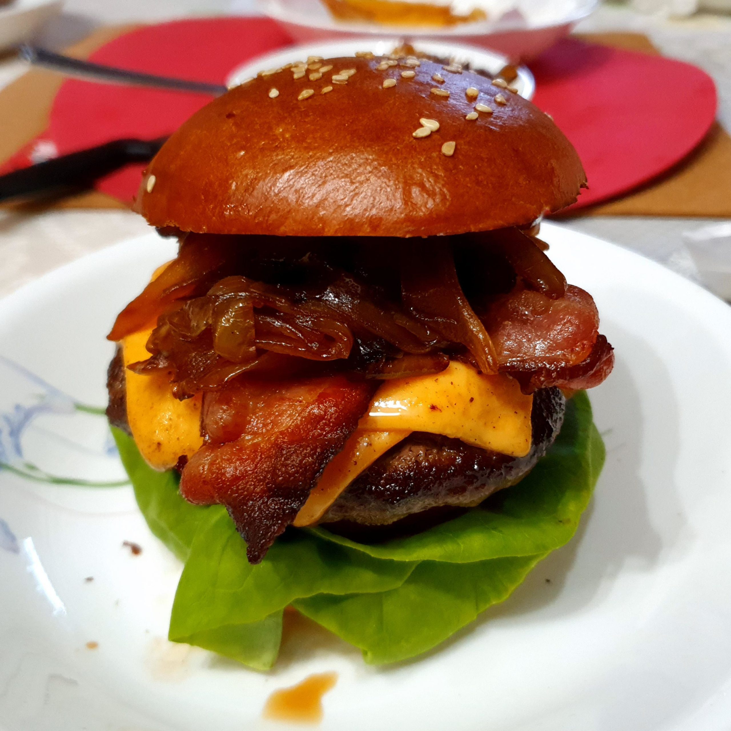 Homemade Burger with Bacon, Lettuce and Tomato, topped with Caramelized Onions