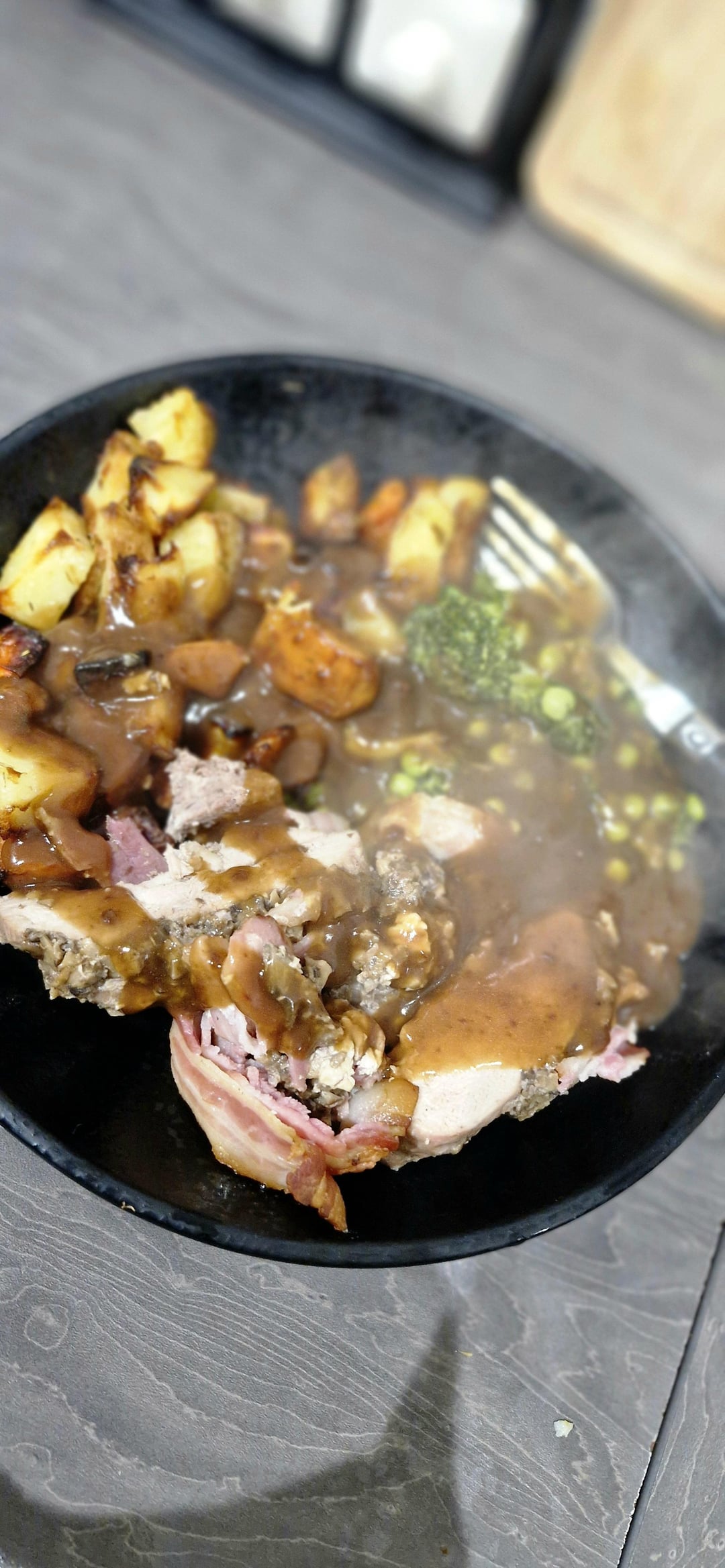 Bacon wrapped pheasant parcel with two layers of chestnut mushrooms fried with blue cheese. Roasted potatoes and carrots on the side plus broccoli and peas. Delish by adhdventures Write A CommentYou must be logged in to post a comment.