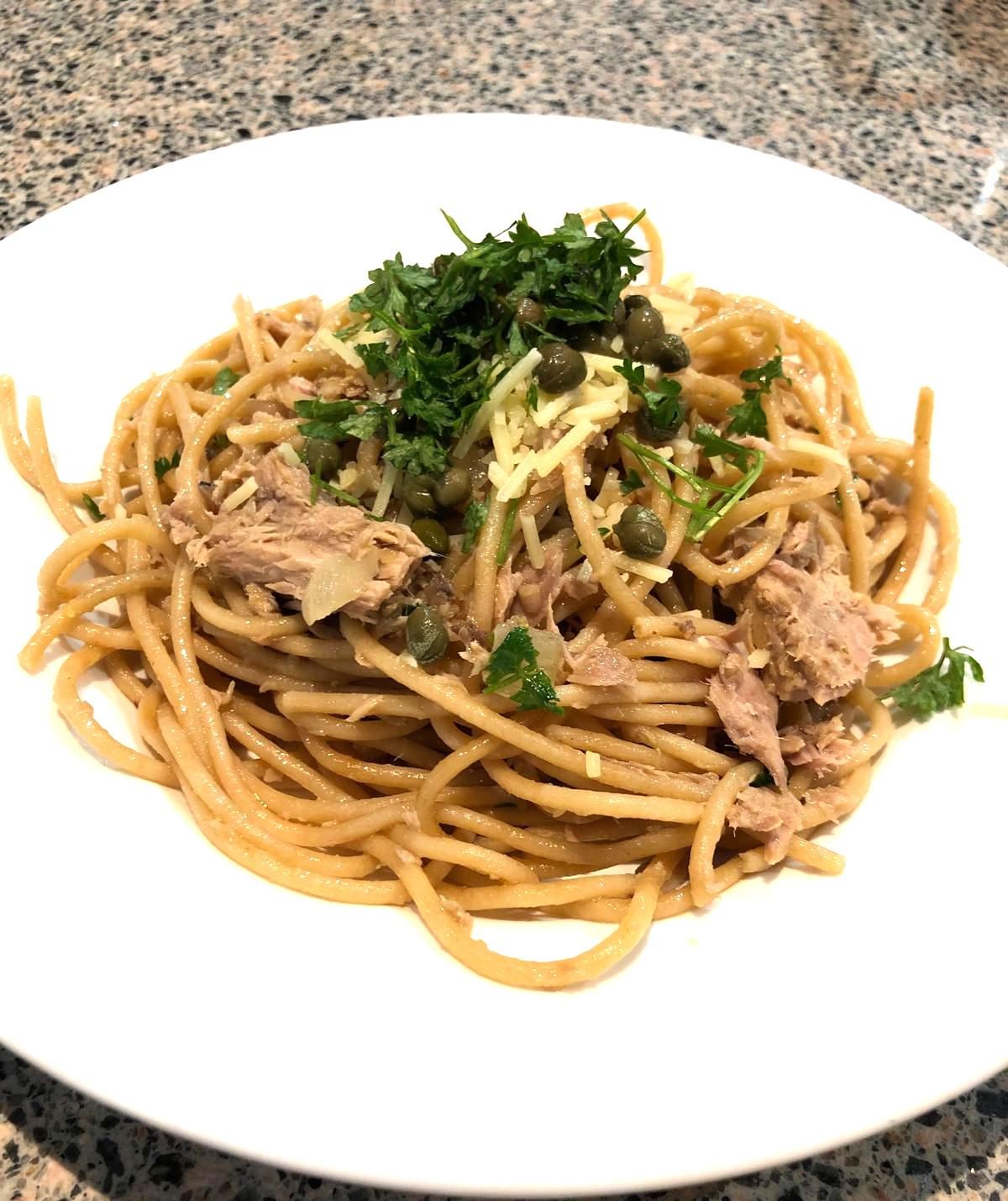 * 500 g Wholemeal Spaghetti * 4 cloves garlic (thinly sliced) * 1 brown onion (diced) * 6 anchovy fillets (salted, in olive oil) * 610 g canned chunks tuna in olive oil * zest of 2 lemons * juice of 2 lemons * 4 tsp fresh parsley (plus extra for garnish, chopped) * parmesan cheese (shaved, to serve) * baby capers (to serve) * optional – chilli flakes (to serve)