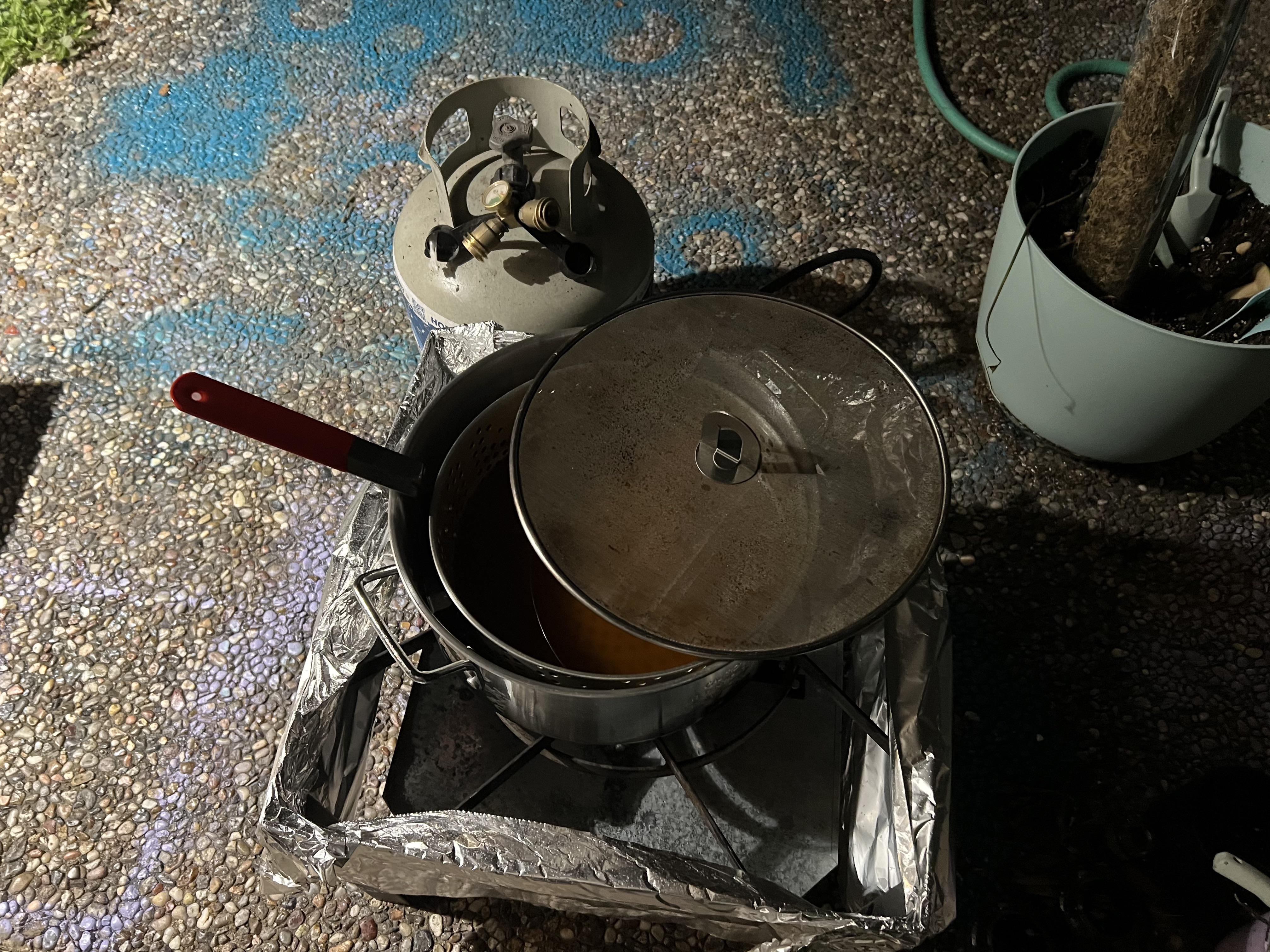 Yes, I always fry mine outdoors and have a similar set up. Recently I upgraded to a cast iron pot from Outdoor Gourmet, big difference in heat retention!