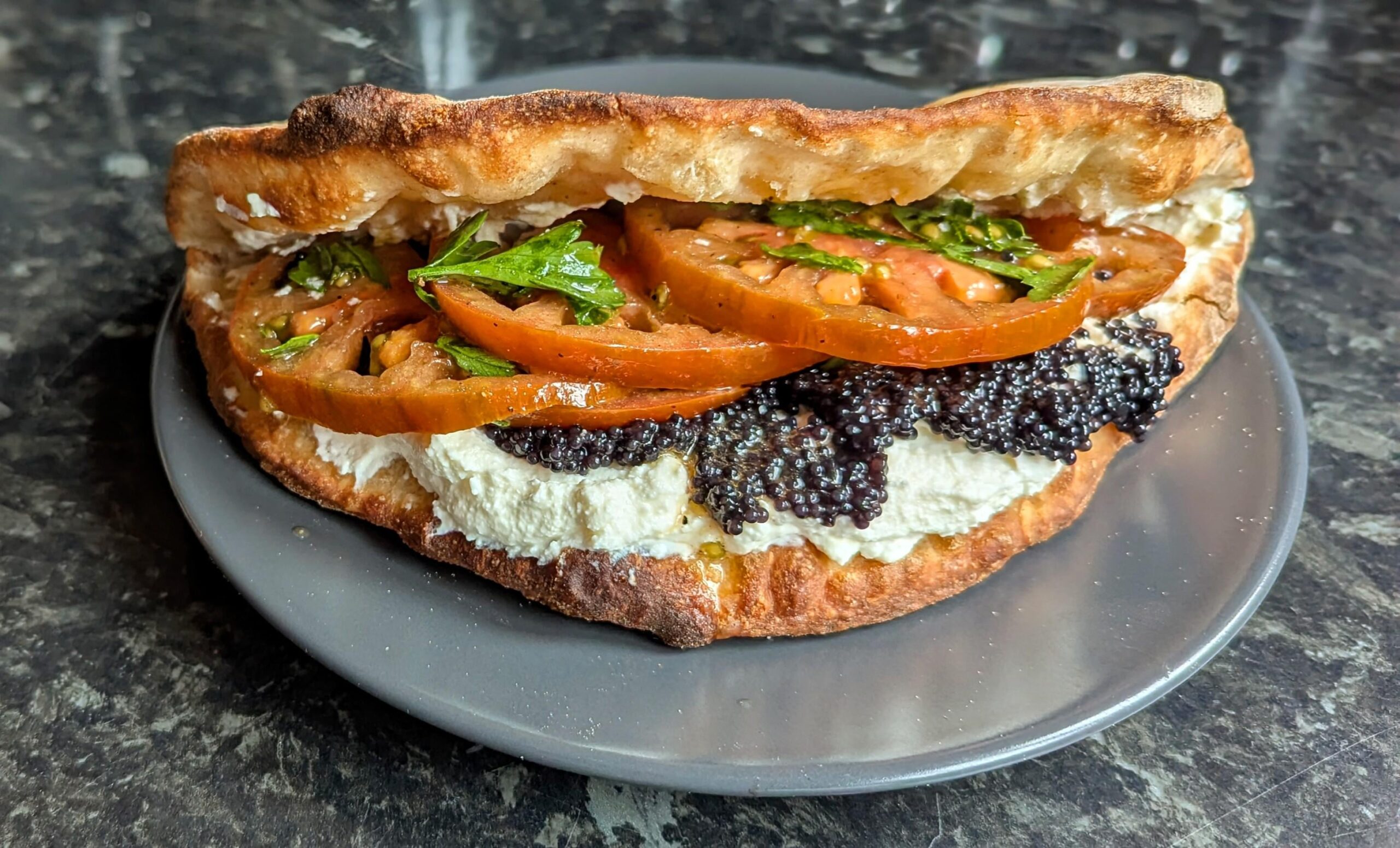 Marinated Winter tomatoes, homemade curd cheese, lumpfish roe