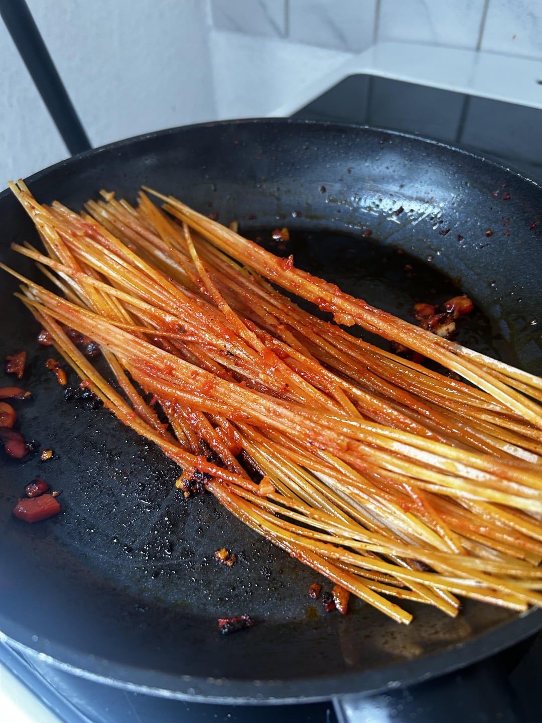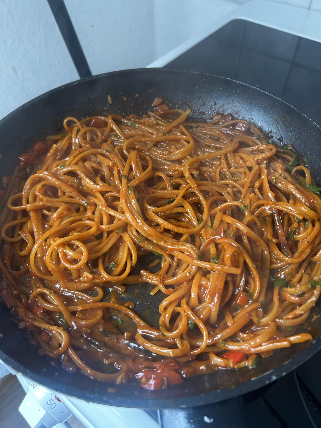 Hi there! Today I prepared this amazing dish for the first time. I changed the Spaghetti for the Linguini since I rather it being thicker. I also used Paprika with Chili Powder instead of Chili itself because the ones I had were simply way too spicy for my taste. It turned out being great!