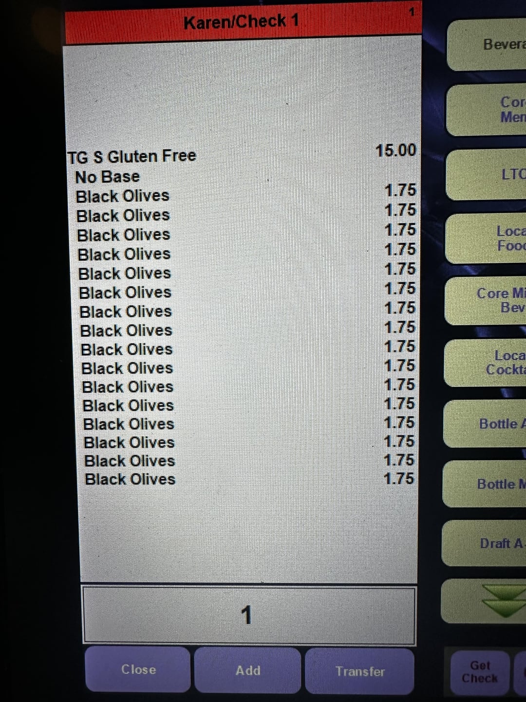 That is 43 bucks btw, 16x Olives and 15 for the Pizza