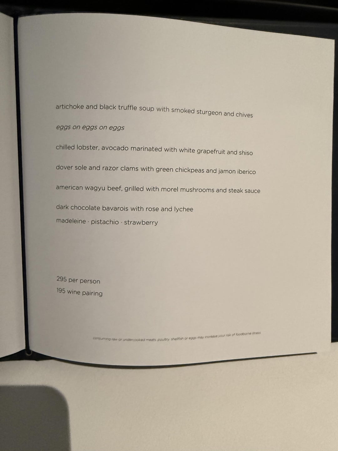 In short, I thought it was delicious and well worth it. It was 295 for 6 courses plus bread and petit fours which seems to be shorter than their normal Tastings menu. The cocktails and mocktails were delicious. The two best dishes arrived in sequence and the first was the Eggs on Eggs on Eggs that lived up to the hype. Rich, gooey, salty, and they brought out a second brioche toast stick to wipe the bowl clean. The next course was a perfectly fresh, acidic, sweet Lobster Avocado Salad that perfectly contrasted with the eggs. The soup was good, the fish unremarkable but a sizable portion, the bread fantastic, and the steak well cooked but on the leaner side. The chocolate cake didn’t quite work for me, I prefer a richer sweet chocolate.