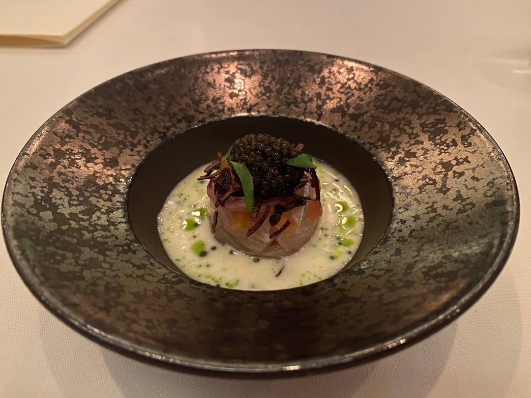 **Striped Jack**-the fish itself is slightly metallic with a bit of sweetness but otherwise pretty neutral. The saltiness of the caviar and the sweet fattiness of the sauce works with the tartness of the tomatos. I like that they thought to have every component represent a taste to it. Combined it’s quite nice. Good Starter. 8/10.