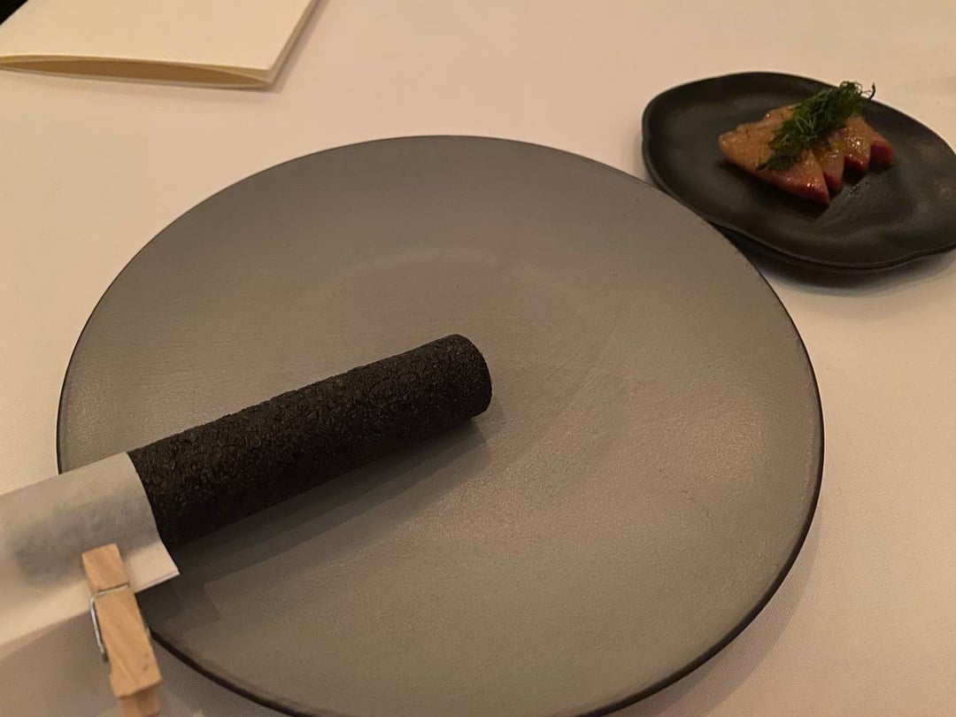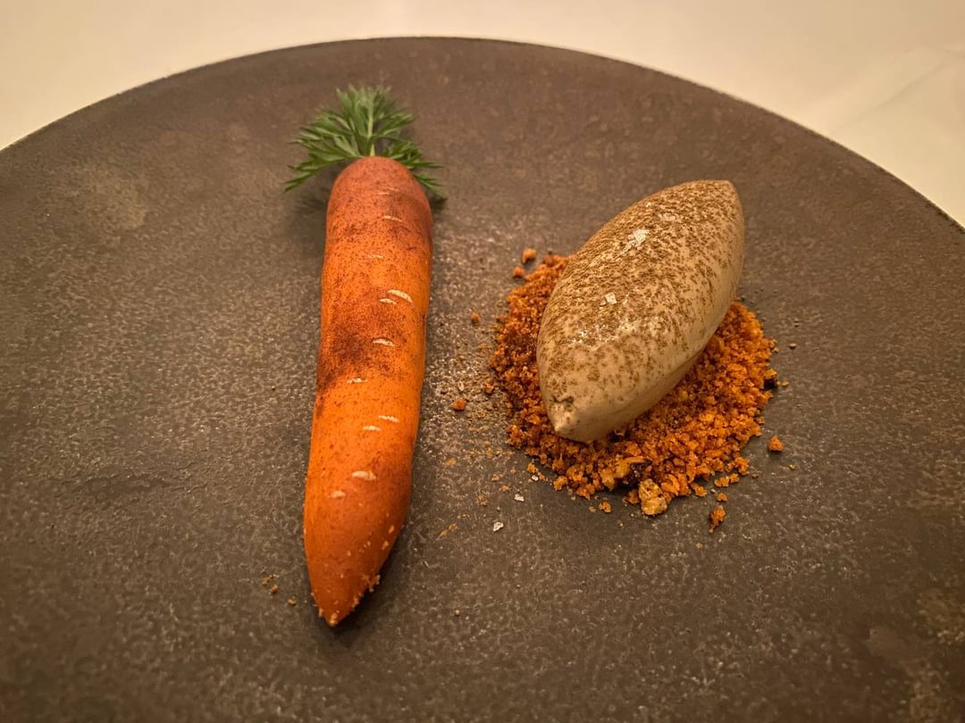 First thing, I sit down and they asked me some questions and I asked for the bathroom. As I got up, I pulled the tablecloth with me and immediately dropped my water and wine glass. Turns out, the tablecloth sags a TON and is drooped in a way that catches really easily on your pants when you sit down. They said this actually happens a lot which is a weird choice to make for table decor if it does. After they cleaned up and I got settled, They asked me if I wanted any wine pairings but weren’t pushy about it. They asked if I wanted any supplements and mentioned that there was only one carrot left so I asked to snag that one RIGHT away. That’s a big reason I came lol