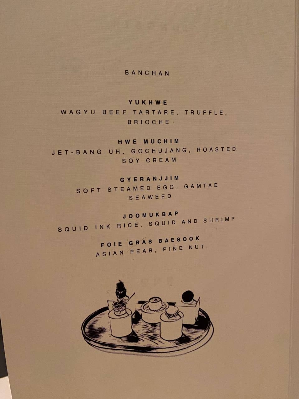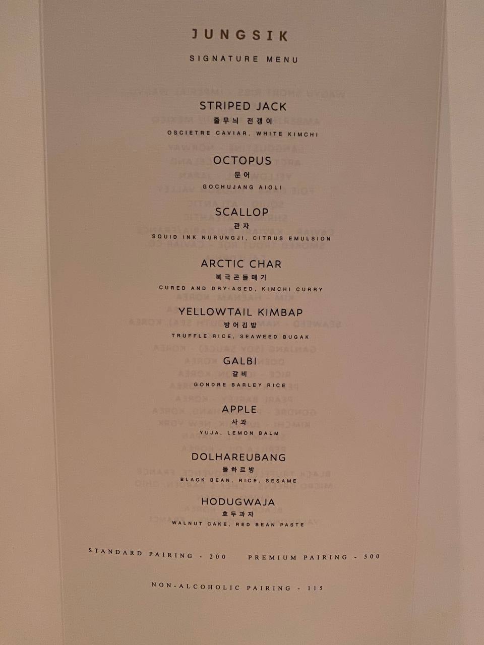 Went to Jungsik in Seoul in 2016 and it’s still easily in my top 5 tastings of all time. I can still remember how mind blowing the Bi Bim Bap was. Think the overlaps I see with your menu are the Octopus and Dolhareubang.