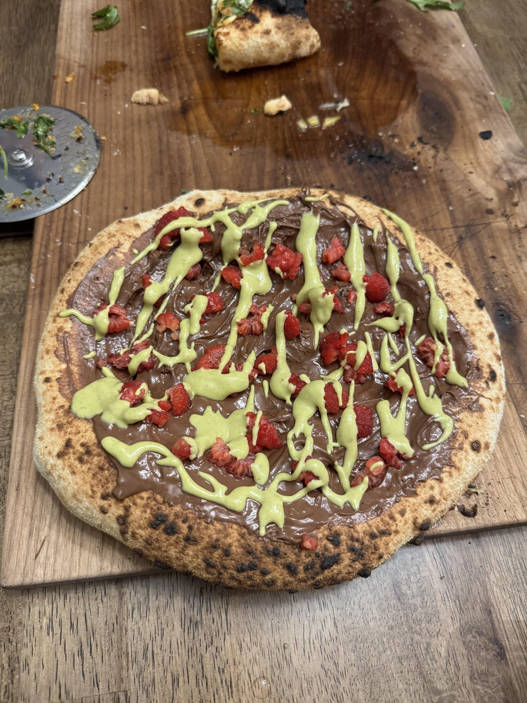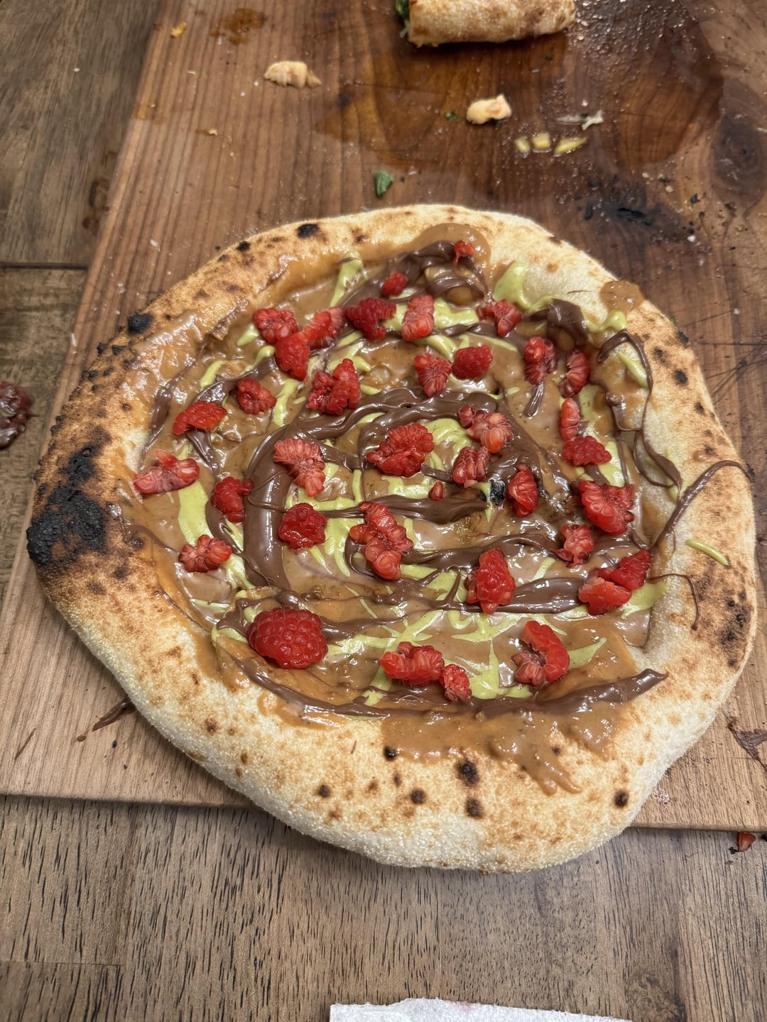 Pizza 1: lemon ricotta garlic sauce with chicken and lemon slices. Arugula, hot honey, and Parmesan after bakingDessert: cooked with ice cubes on it. Nutella, cookie butter, pistachio cream, and raspberries. by bpat Write A CommentYou must be logged in to post a comment.