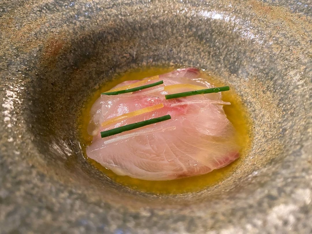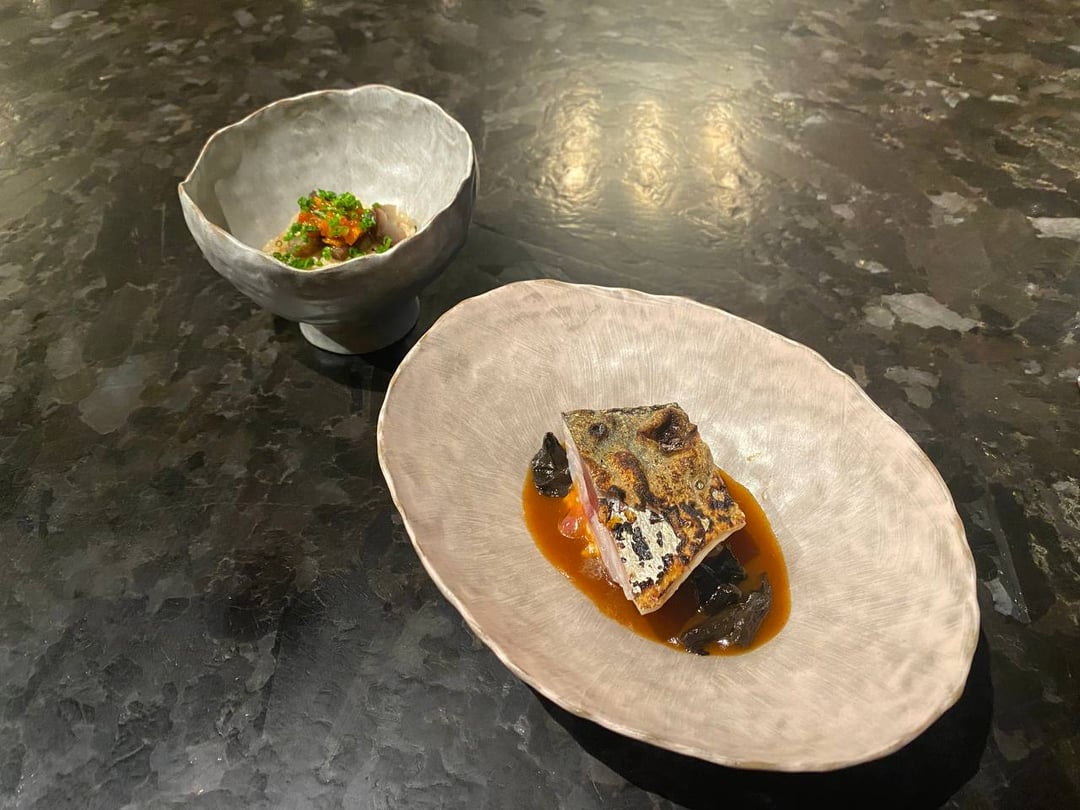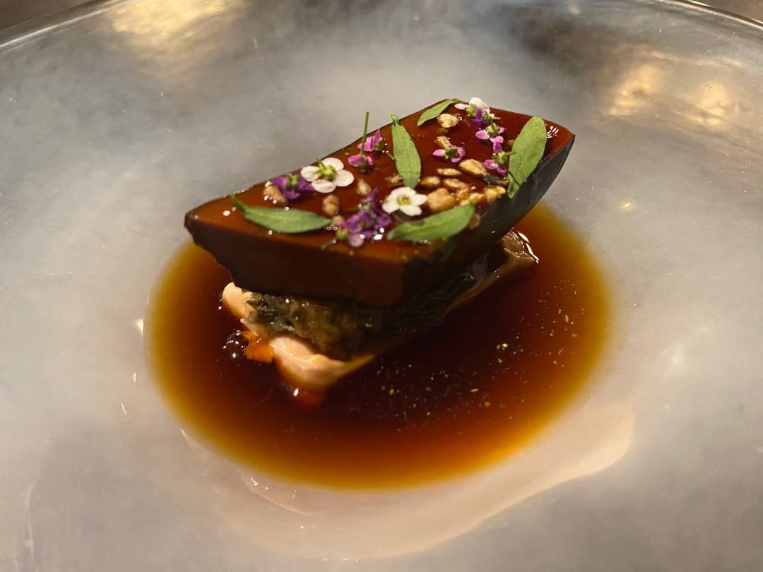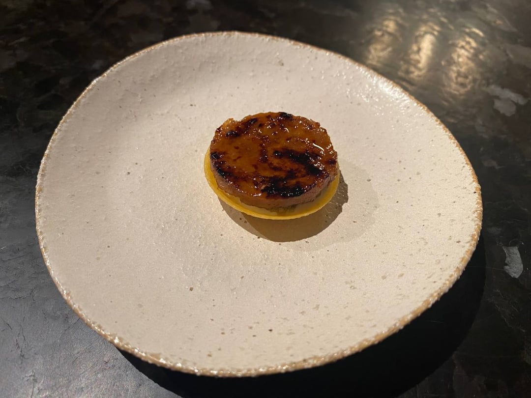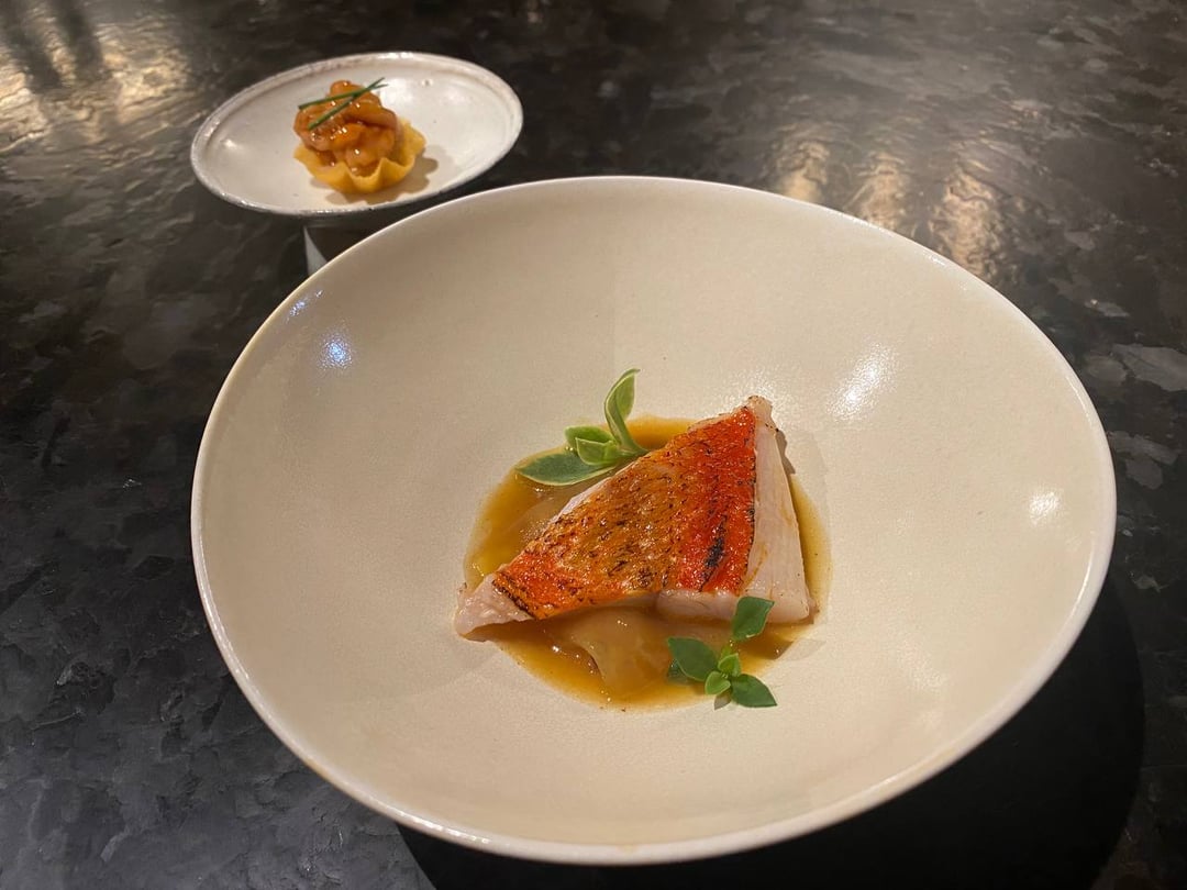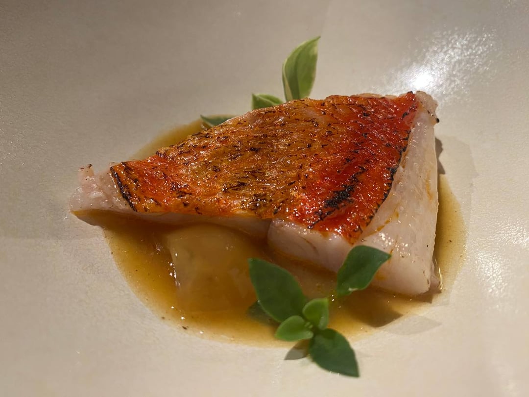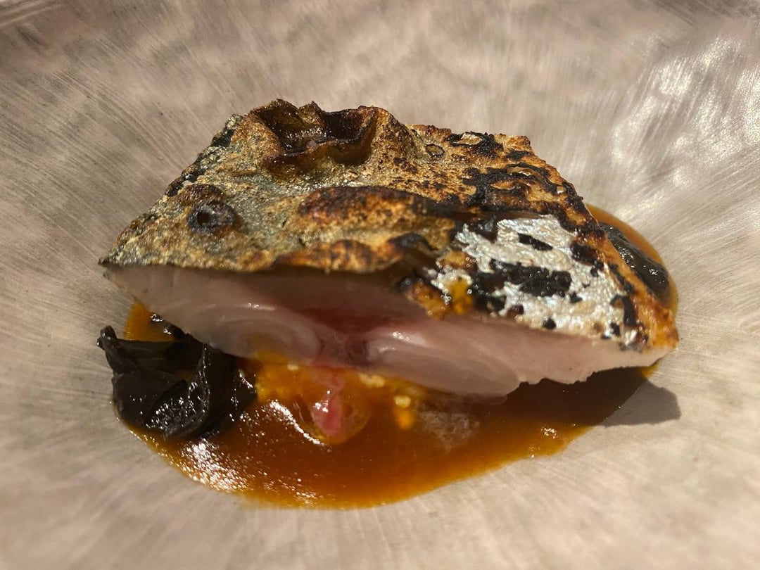 **Golden Eye Snapper**-the char smell is super present and I appreciate that. The fish itself is firm and pretty neutral. The sauce is like all spice, habanero, and a tiny bit of sriracha. The tartlet is almost like a slightly fishy foie gras but creamy and with a hint of apple? 7.5/10