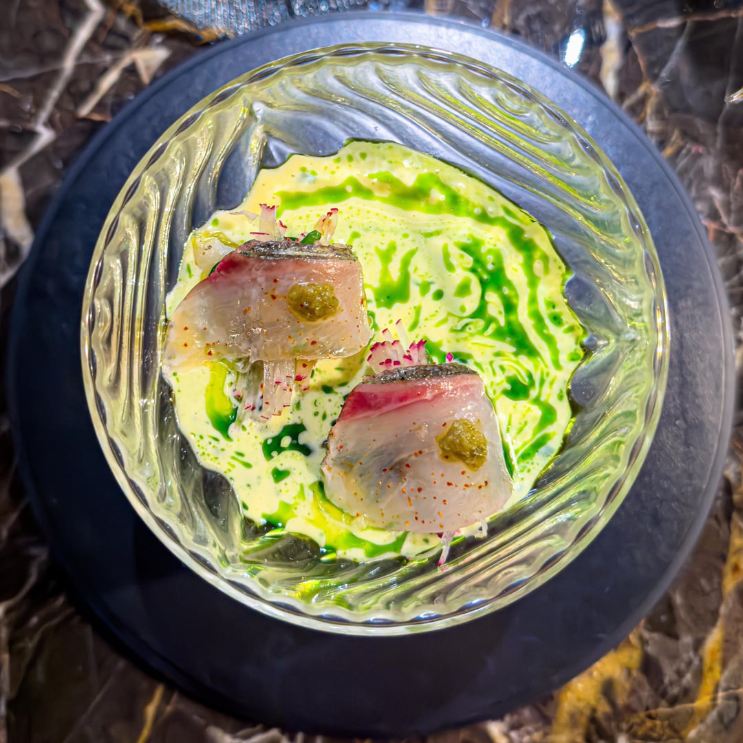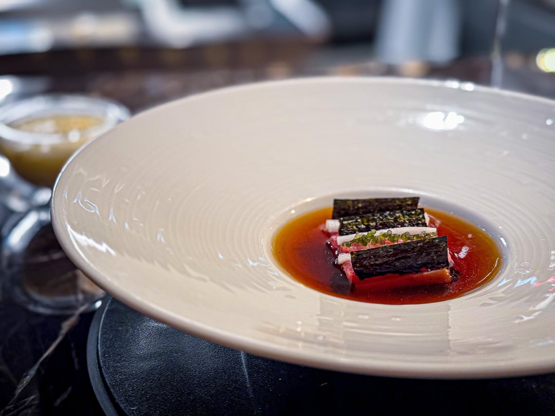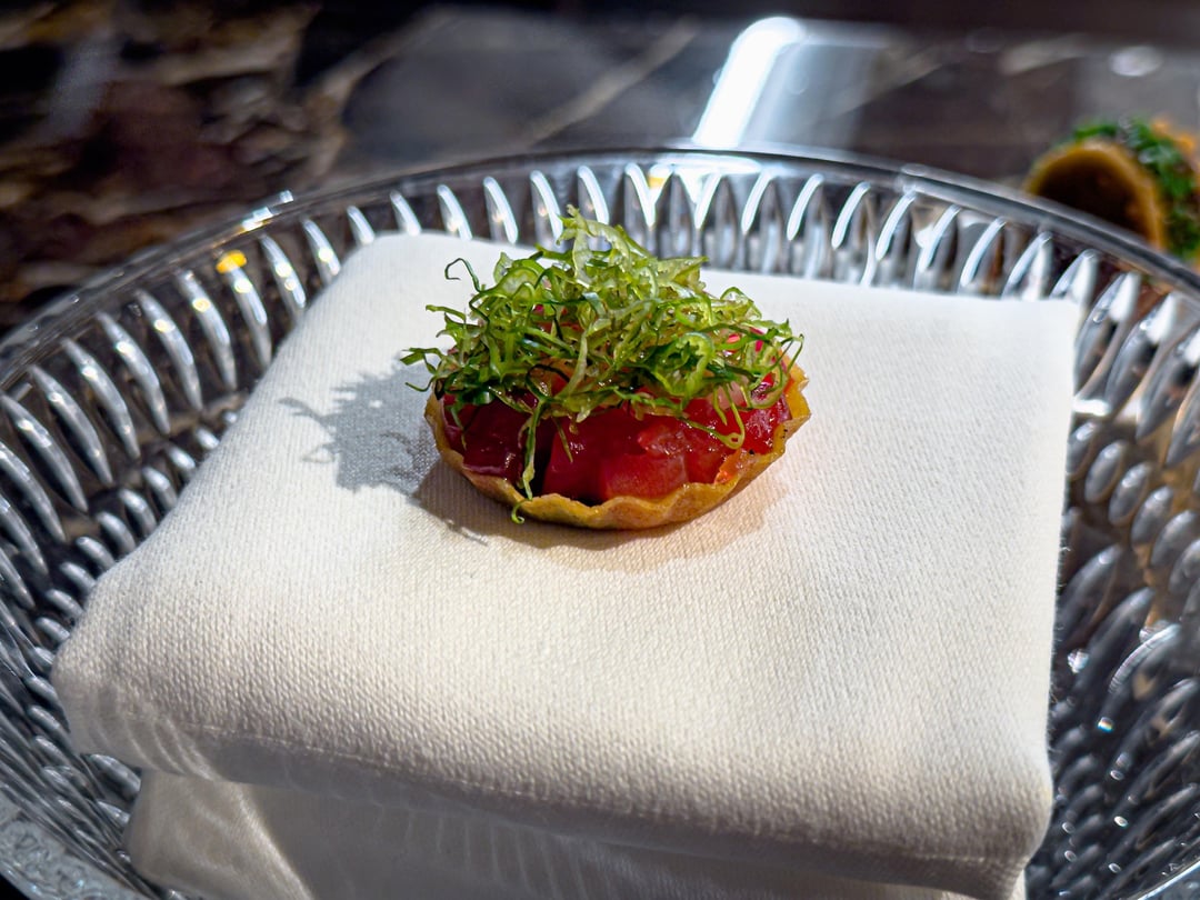 – 6” offset plating tweezer was a bit of a weird cutlery choice for the sashimi dishes at the start. It’s cool in a way that you’re using the same tool as the kitchen, but in terms of comfort a fork and/or chopsticks would’ve been a better choice imo.