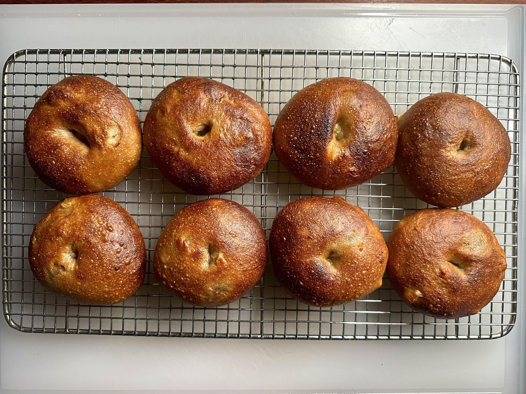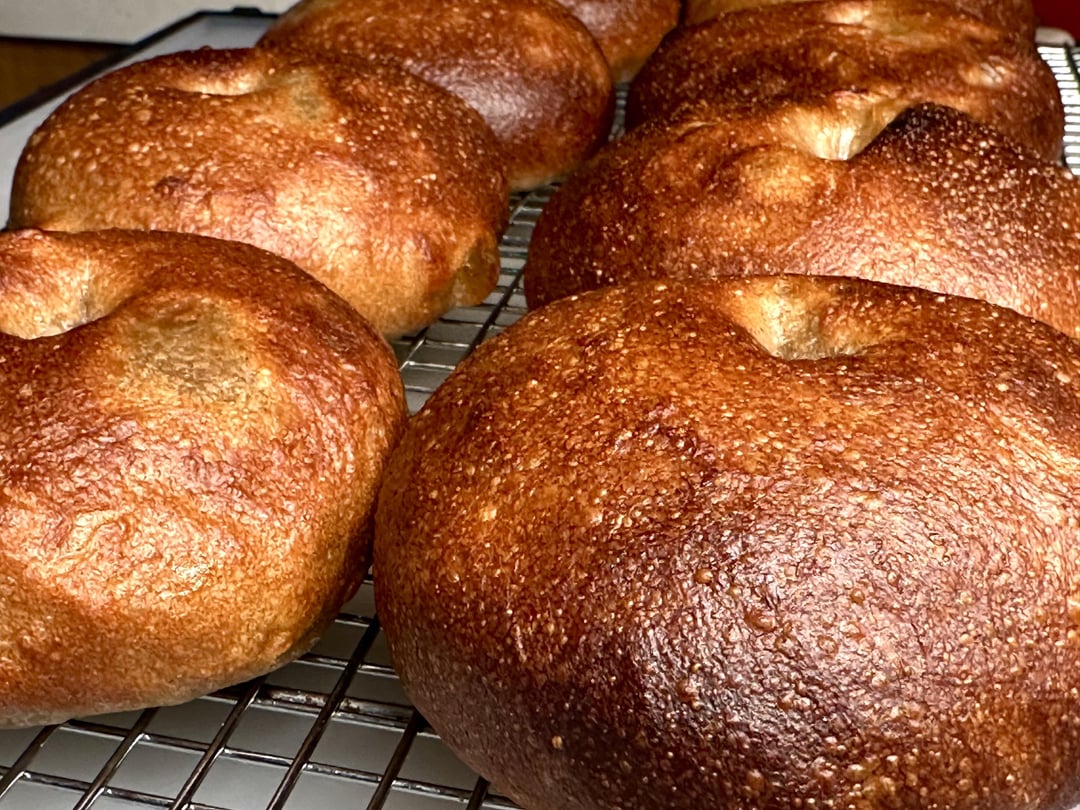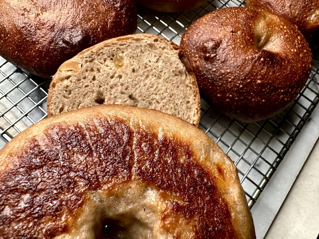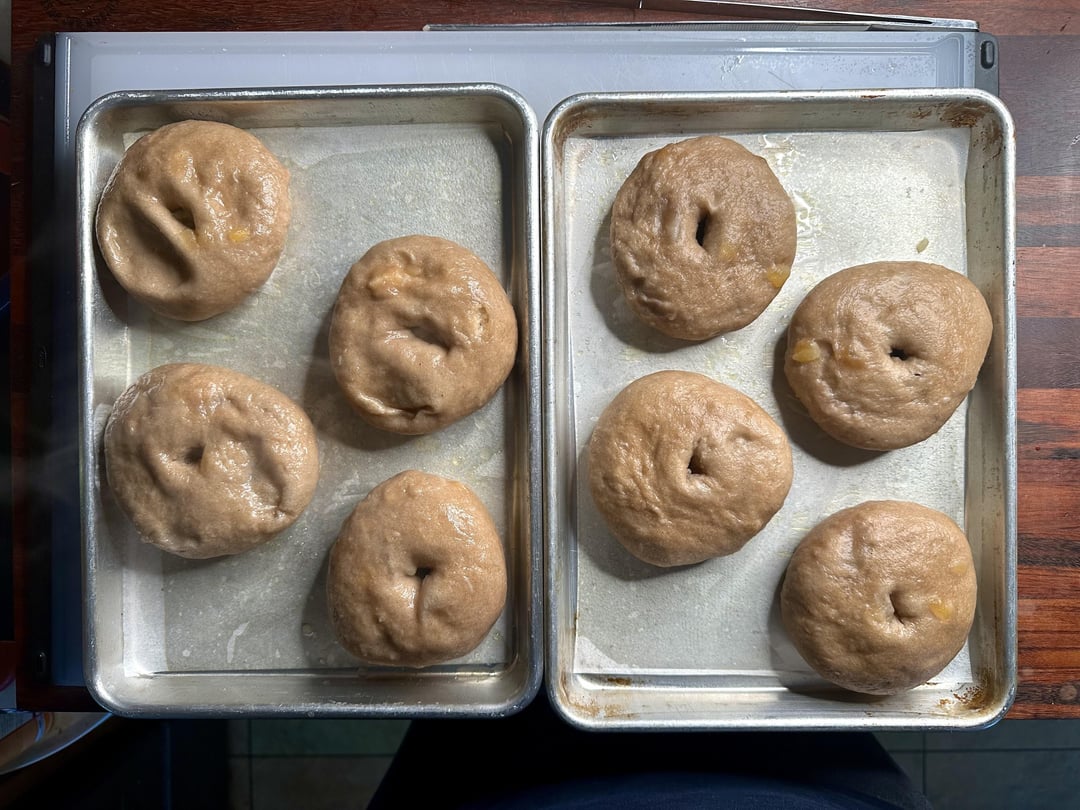My first batch of sweet bagels. These apple maple cinnamon bagels were very nice. I used the basic KA recipe and added 1TB of cinnamon, 3TB brown sugar, and 1/4 cup of maple syrup to the dough, 1/2 cup of diced dried cinnamon apples, and some additional syrup in the boiling liquid. I also did a 24 hour cold proof. Show here with a schmear of Allouette cheesecake spread.