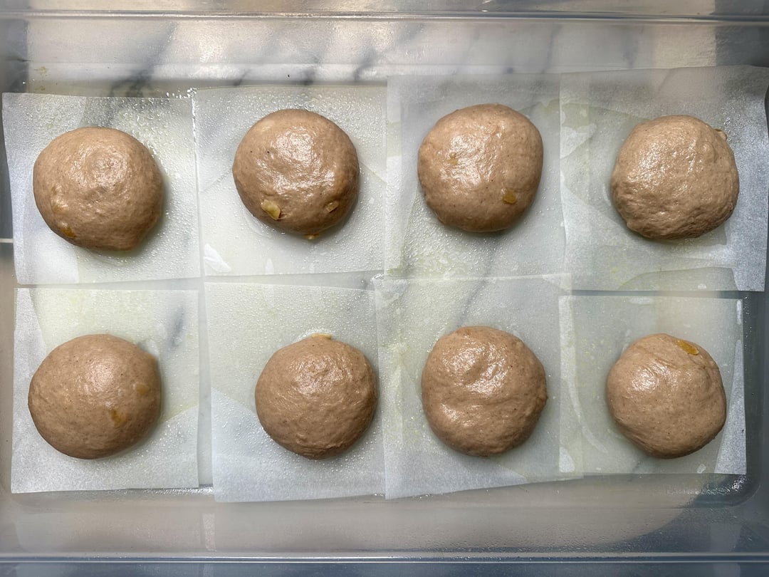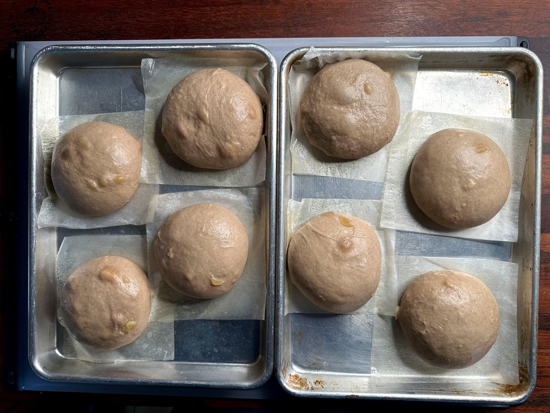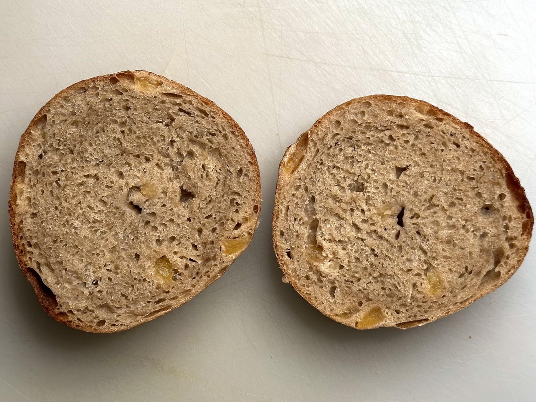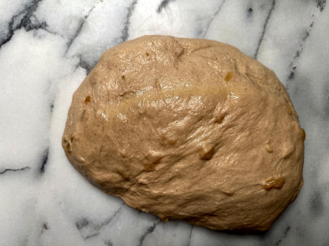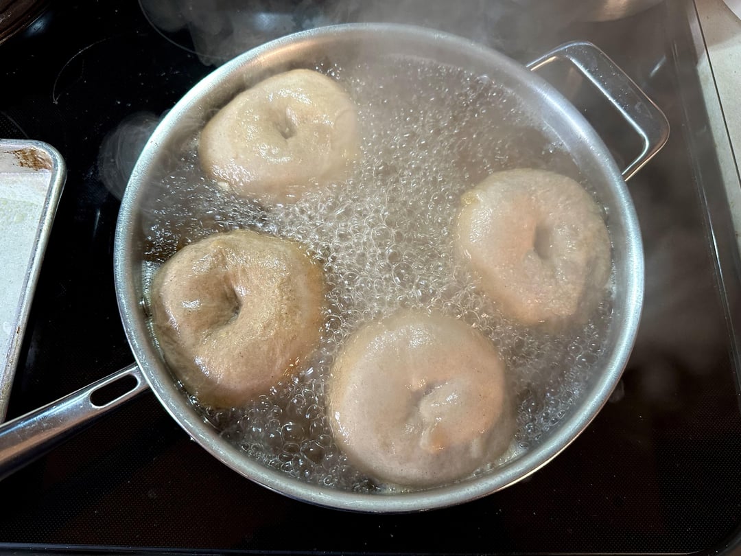 My first batch of sweet bagels. These apple maple cinnamon bagels were very nice. I used the basic KA recipe and added 1TB of cinnamon, 3TB brown sugar, and 1/4 cup of maple syrup to the dough, 1/2 cup of diced dried cinnamon apples, and some additional syrup in the boiling liquid. I also did a 24 hour cold proof. Show here with a schmear of Allouette cheesecake spread.