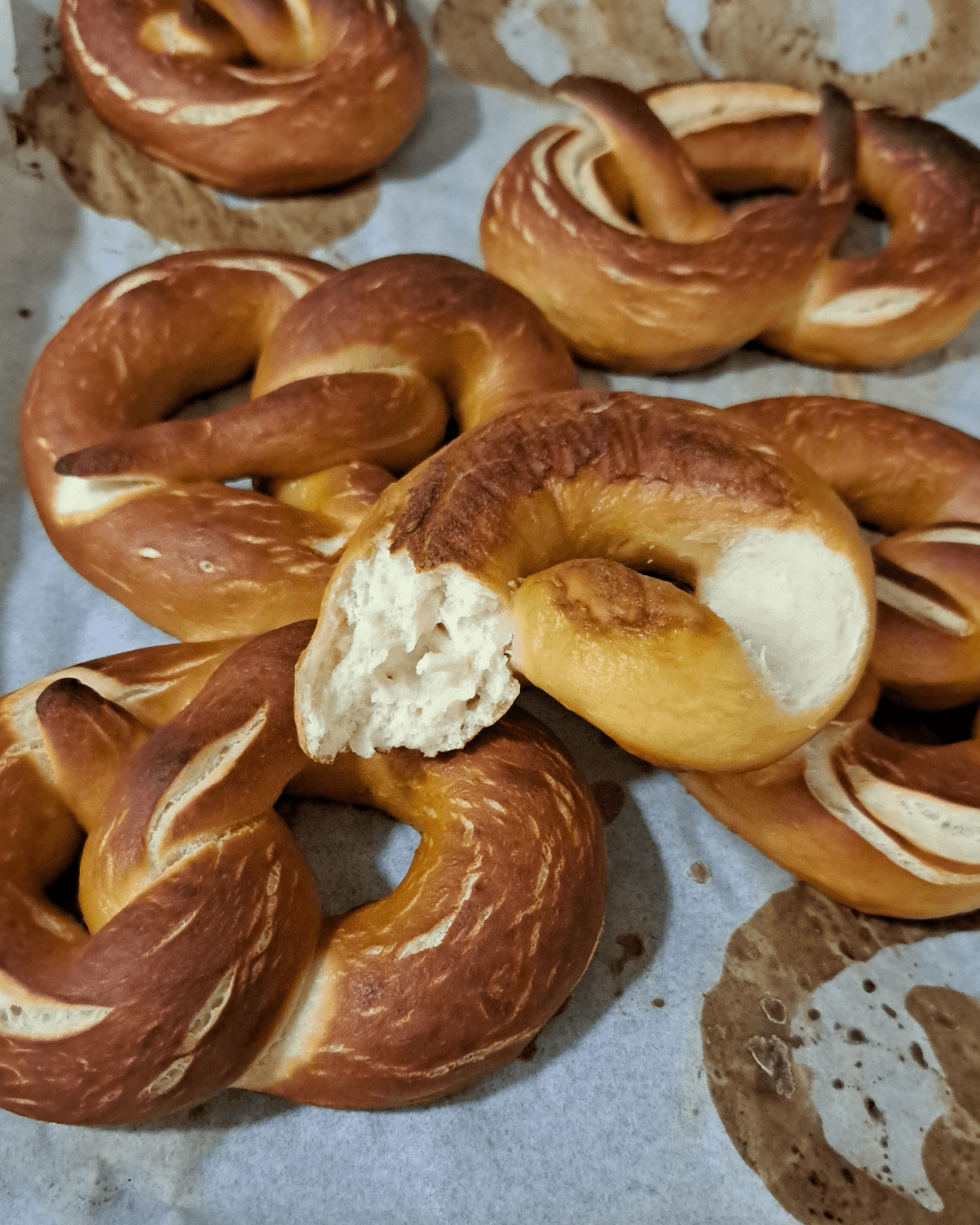 I made prezels today for the first time! Boiled in a baking soda solution for 30 seconds, and then I got so excited I absolutely forgot to add salt on top! Well, next batch for sure..