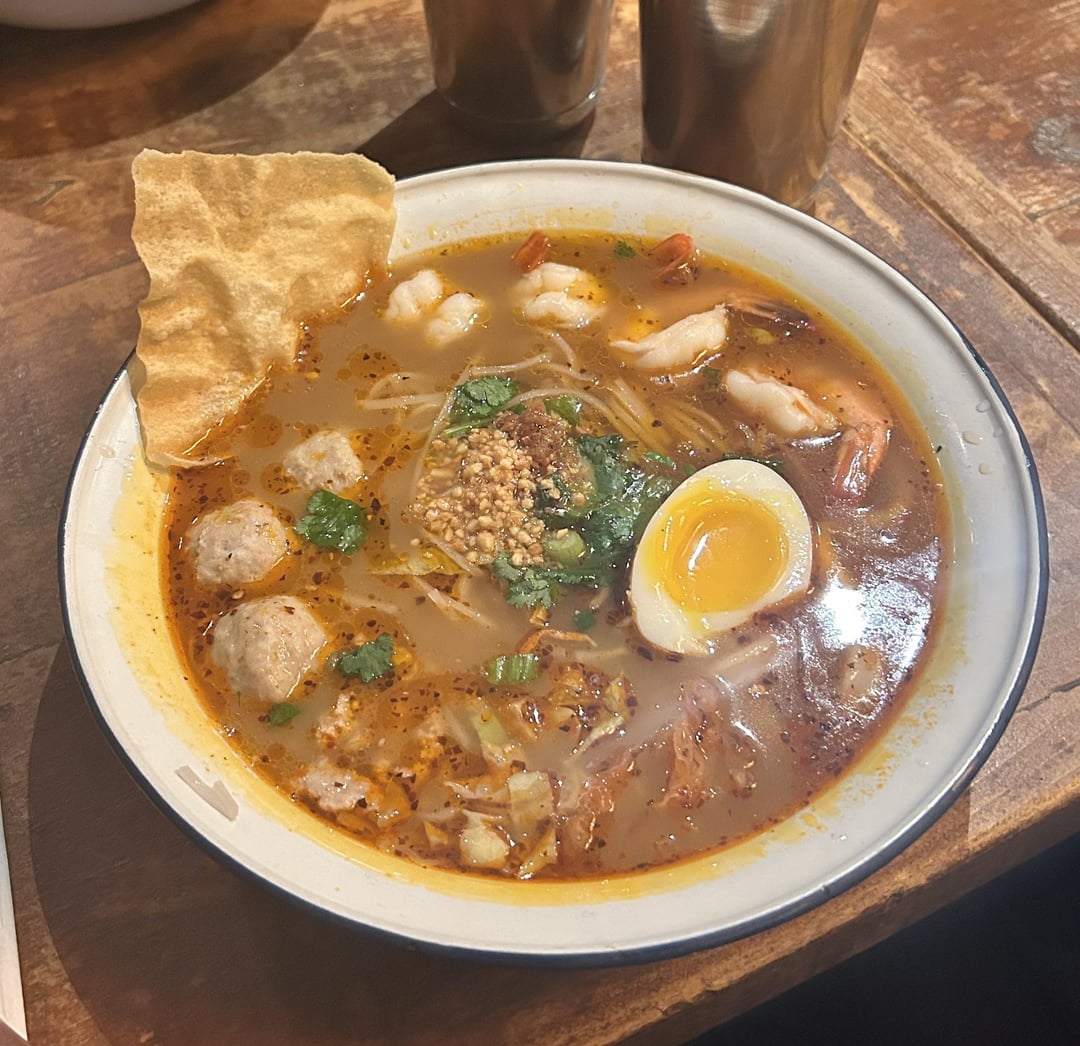 This is a loaded tom yum soup with rice noodles, porc meatballs (5 pieces), shrimp (4 pieces), calamari (10 pieces), half of a boiled egg and some peanuts as topping. In the second picture I left half of the broth and maybe 1/3 of the noodles. I also didn’t eat the fried thing on the side. I logged 800 but I’m hoping it was an overestimate. Thanks in advance!