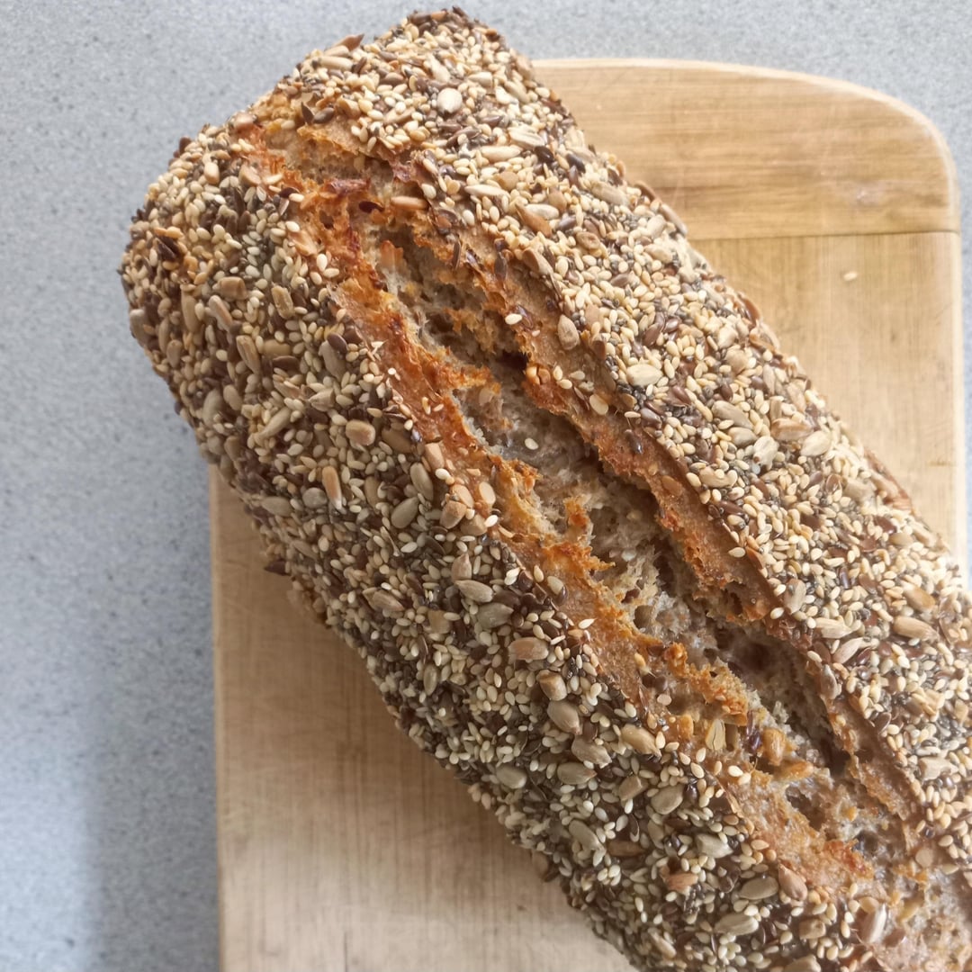 166g wholemeal flour, 334g of dark rye flour, 450g of water, 150g of mixed seeds (i used sesame, flax, sunflower and chia) 100g of starter and 10g of salt. Mix all together (save some seeds for later) and let it ferment for 8h at room temperature while stirring it every hour or so (it will stay very sticky). Transfer to an oiled loaf pan, cover with more seeds (don't put too much, I did and my kitchen bench was a mess once I cut into the bread) and leave in the fridge overnight. Preheat your oven at 250c, in the meantime take the loaf out of the fridge to warm up a bit. Bake at 250c for 20min then 180c for 30min.