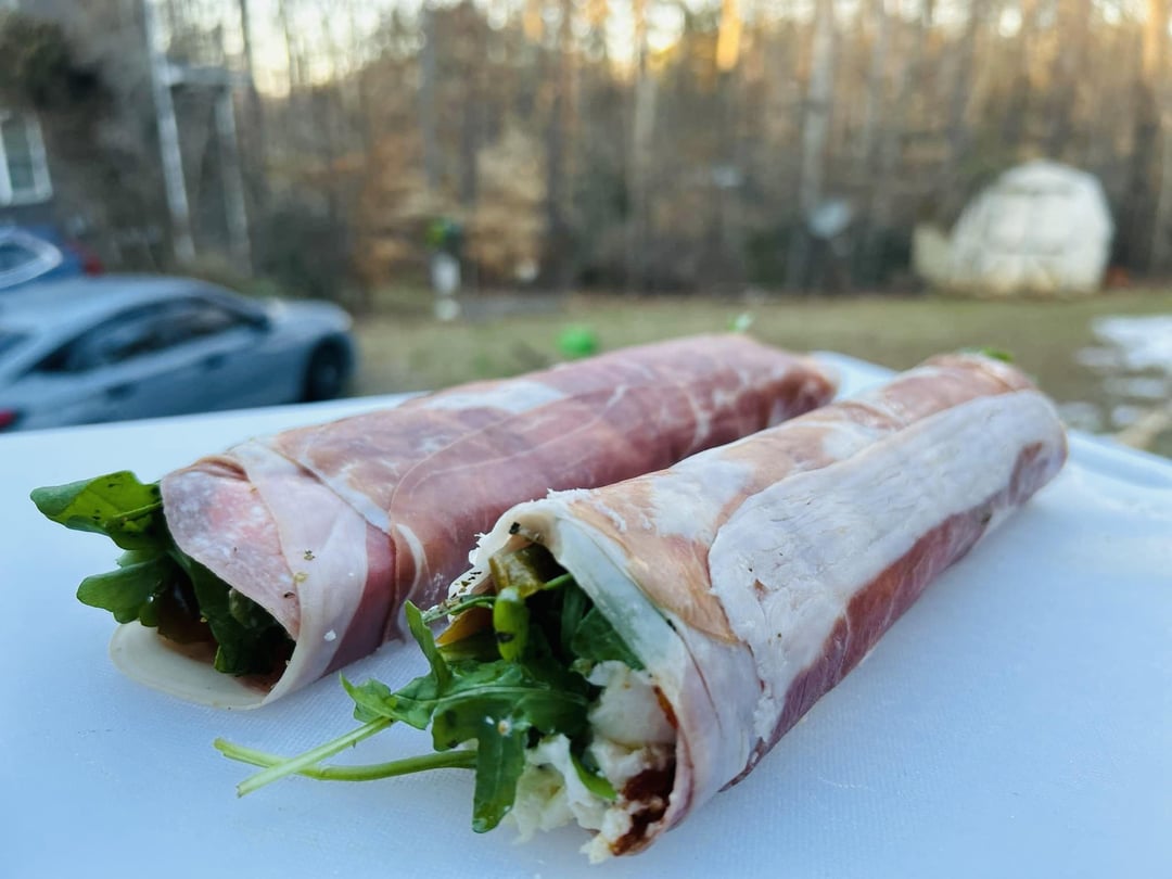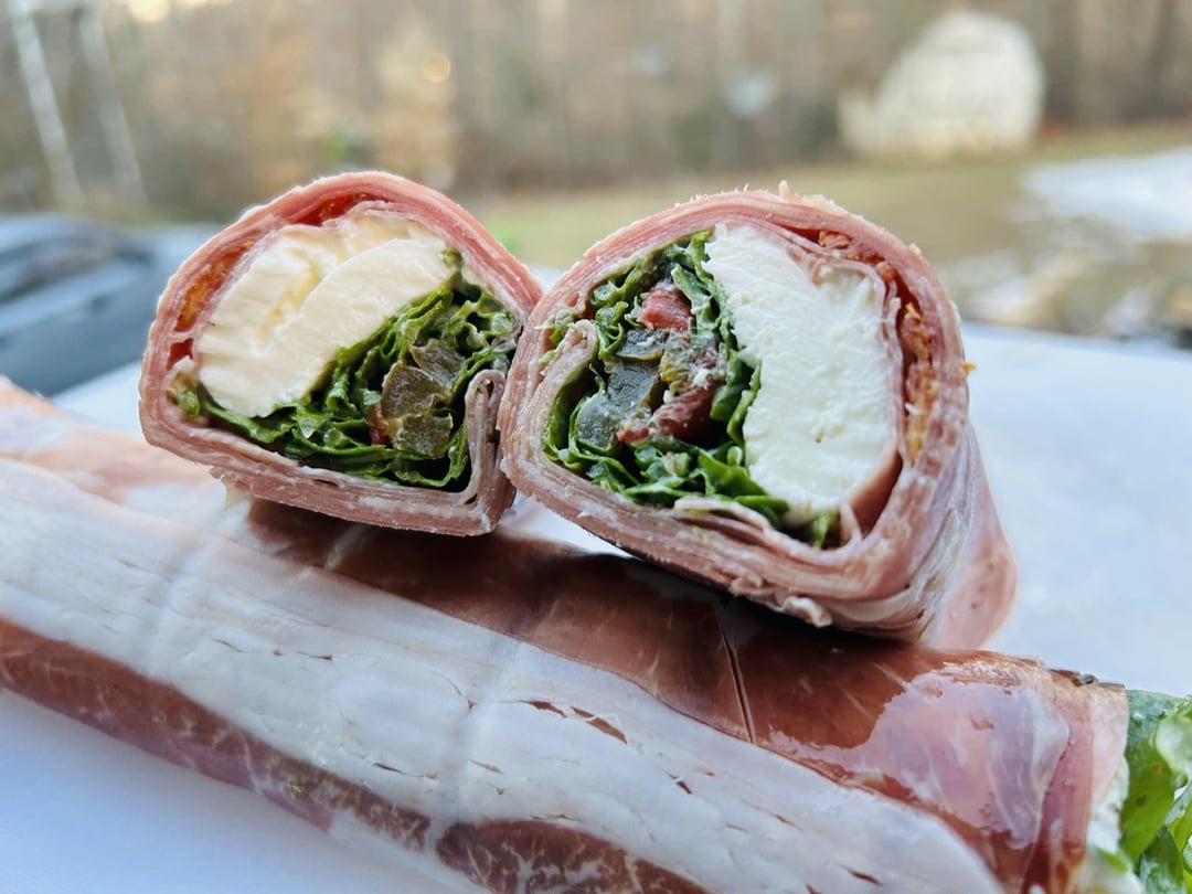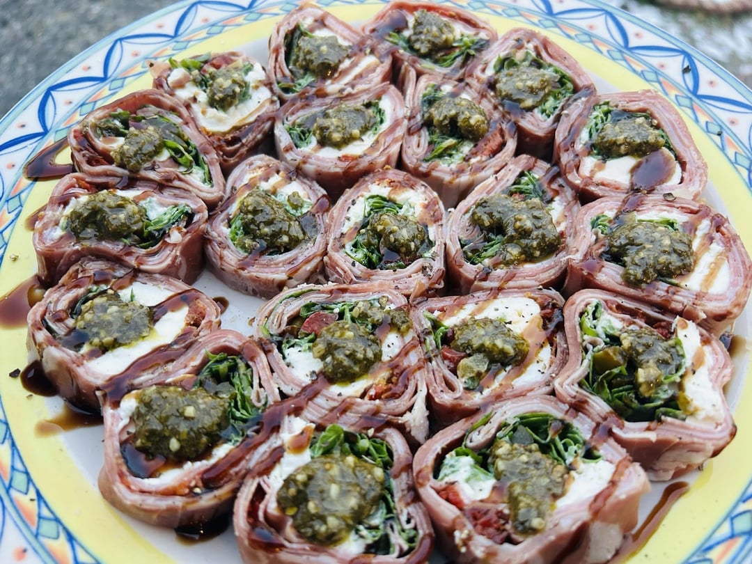 Italian Sushi: Prosciutto, Salami, Arugula, Burrata, Sun-Dried Tomatoes, Sweet Peppers, Balsamic Glaze and Pesto.