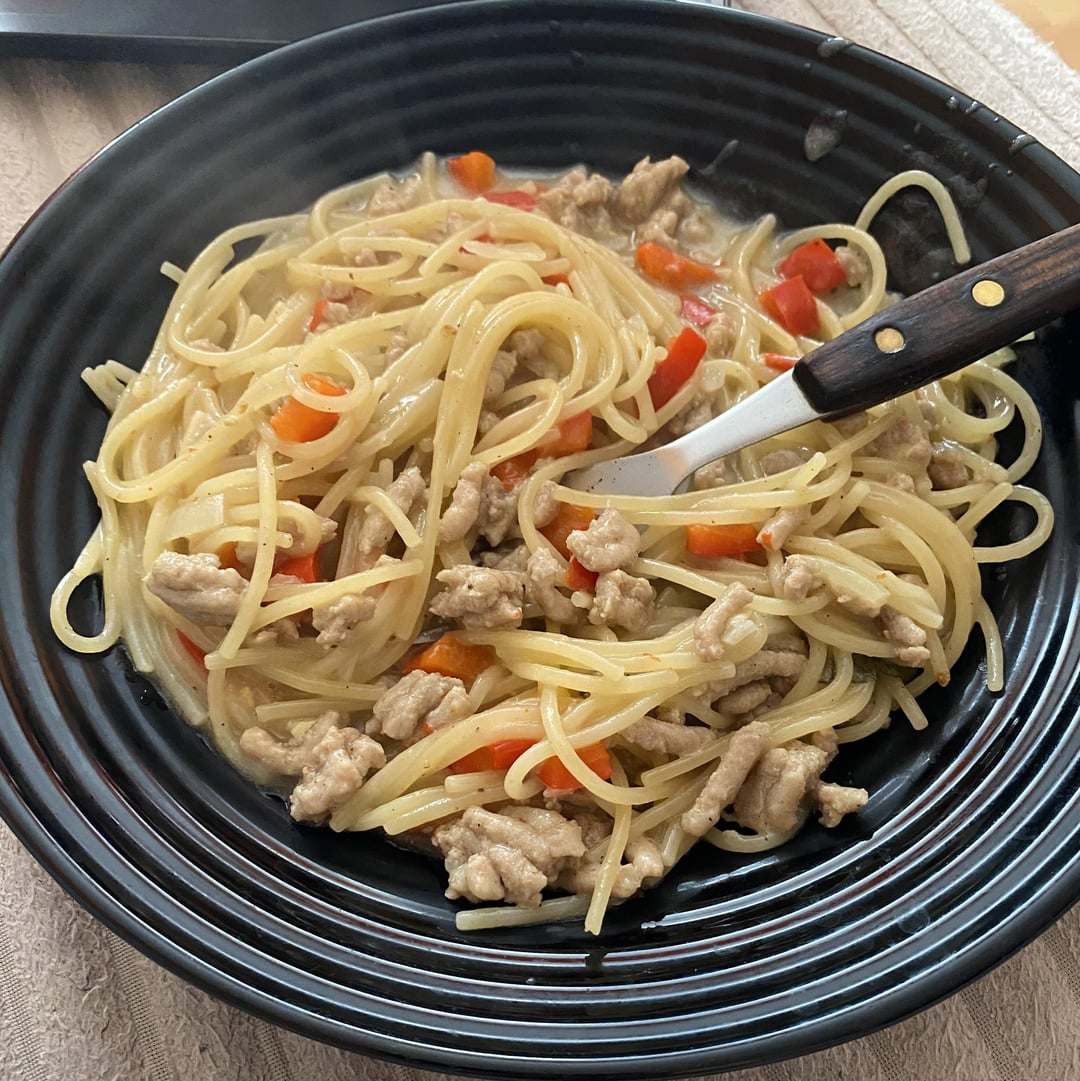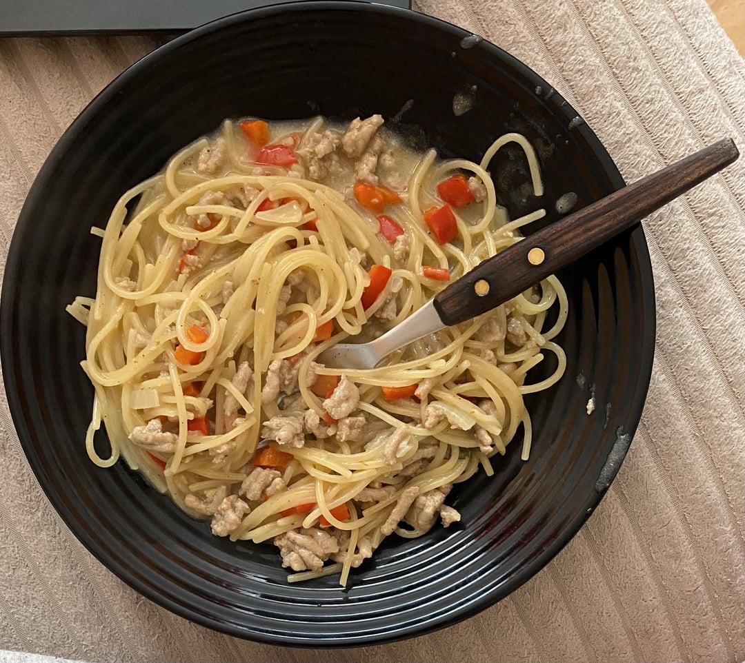 It’s spaghetti, bell pepper, ground pork and some kind of sauce. I know that 🍝 is very calorie dense but I never eat pasta so I have no clue how much that might be (I’m not home so scale is unavailable).