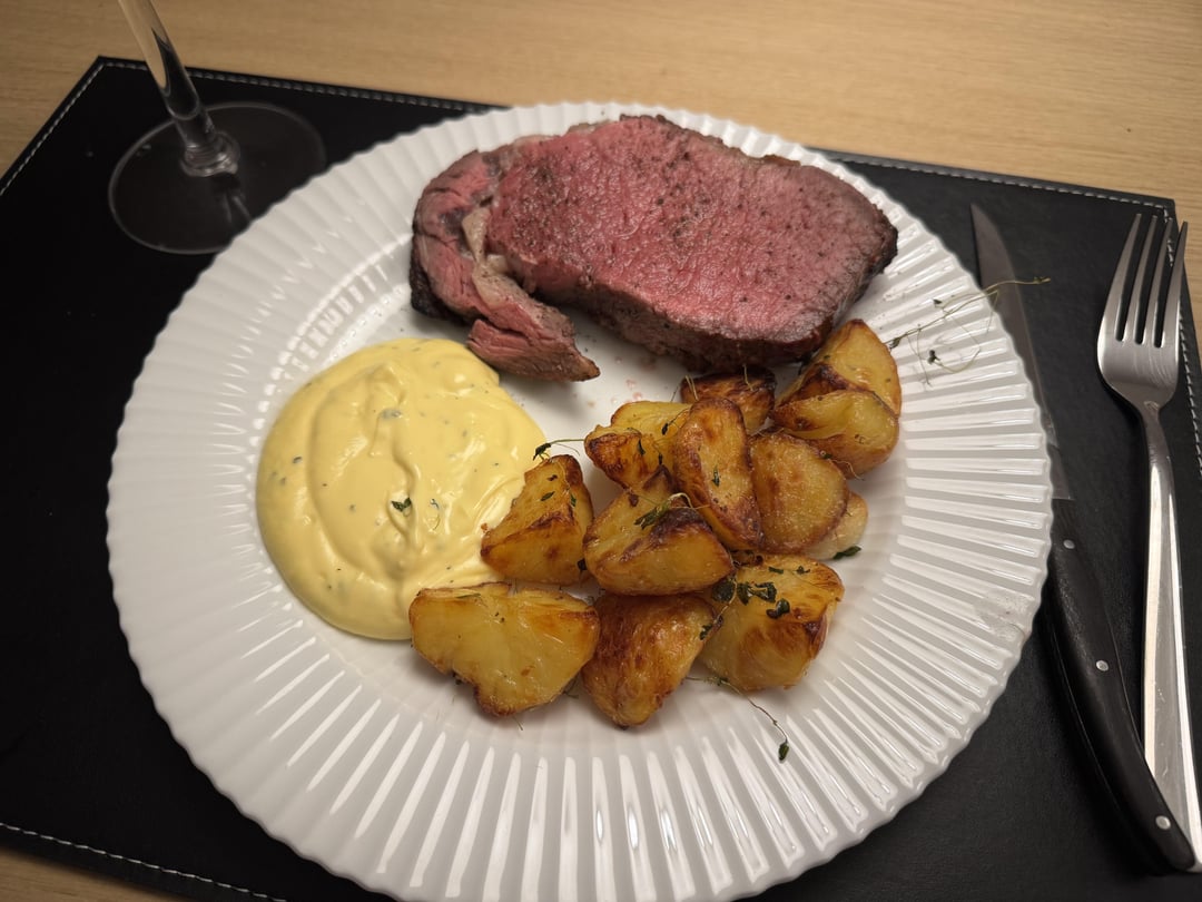 Potatoes inspired by Heston Blumenthal, but I didn't have the time to perfect them. Store bought bearnaise sauce.