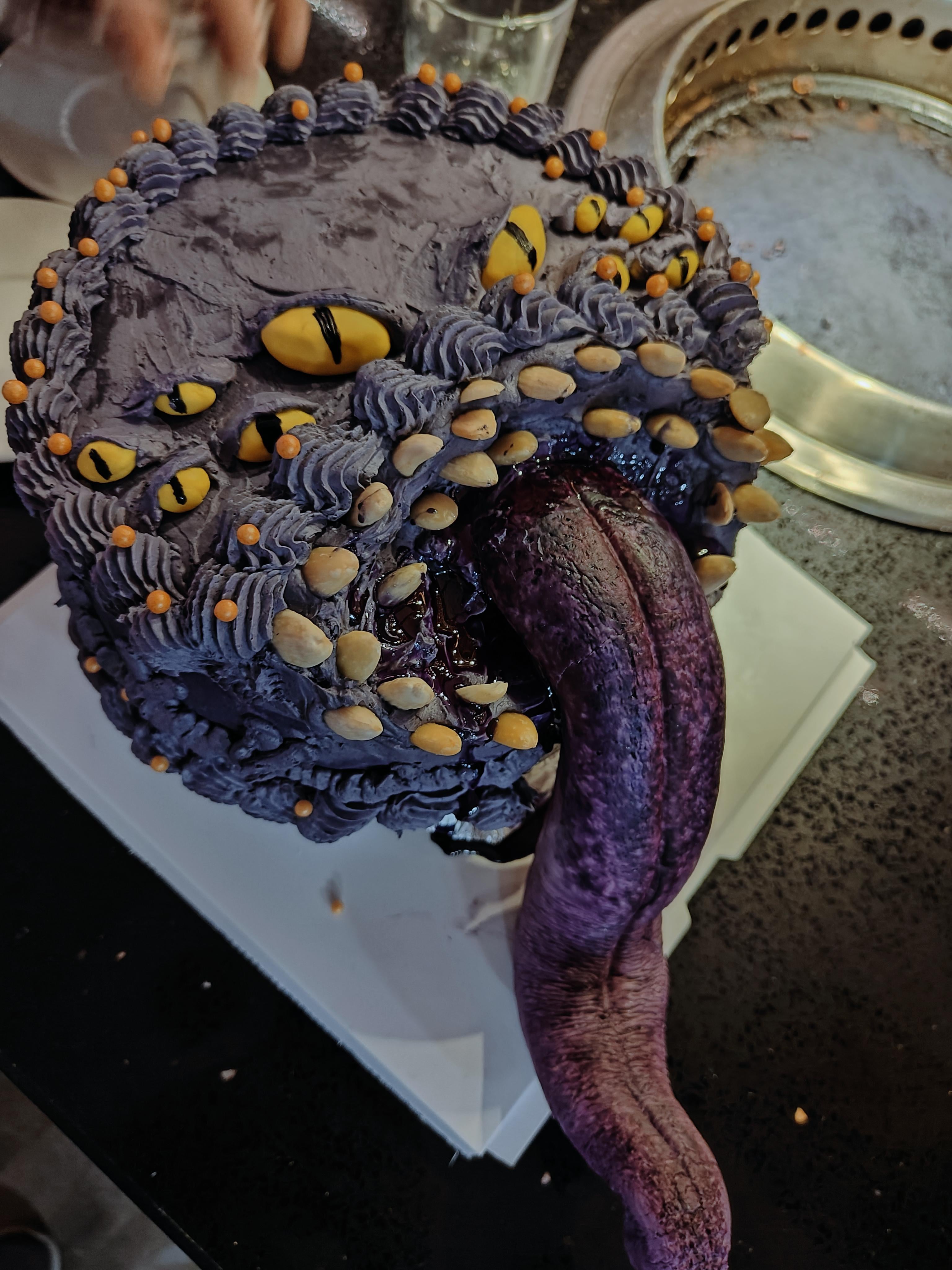 you should cross post this to some dnd subs! this cake is awesome and creepy. absolutely perfect, you did a great job. what does it taste like?