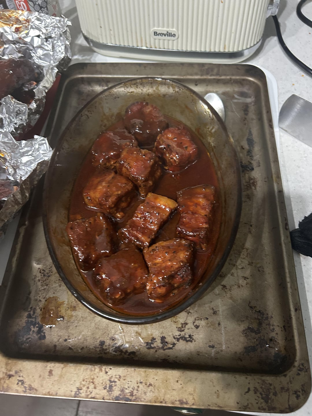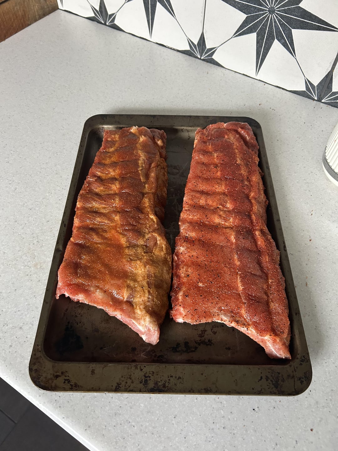 Can’t recommend Meat Church’s Holy Gospel and Hot Honey Hog on ribs enough. They both give amazing colour. I also spritzed these with a mix of apple juice and Jack Daniel’s every hour.