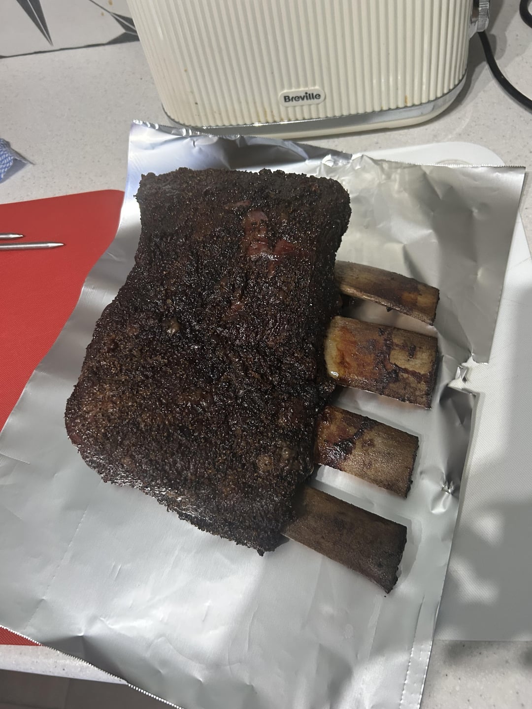 I was up at 4:30am this morning to put the beef short ribs on. Seasoned with Franklin Brisket Rub!