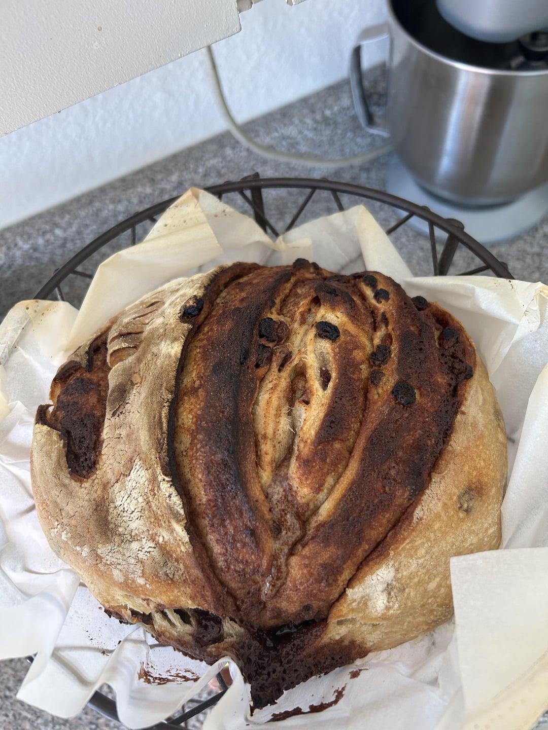 Mixed 100g of rye starter with 375g of water then added in 500g of bread flour. I I let it autolyse for about 45 mins and then added 10g of salt. I soaked 125g of raisins in water for 45 mins, then strained and dried mostly. After adding the salt I gradually added all of the raisins during the first set of SF. I did about 4 SF an hour apart. The dough bulk fermented on the counter for about 7ish hours (including stretch and fold time).