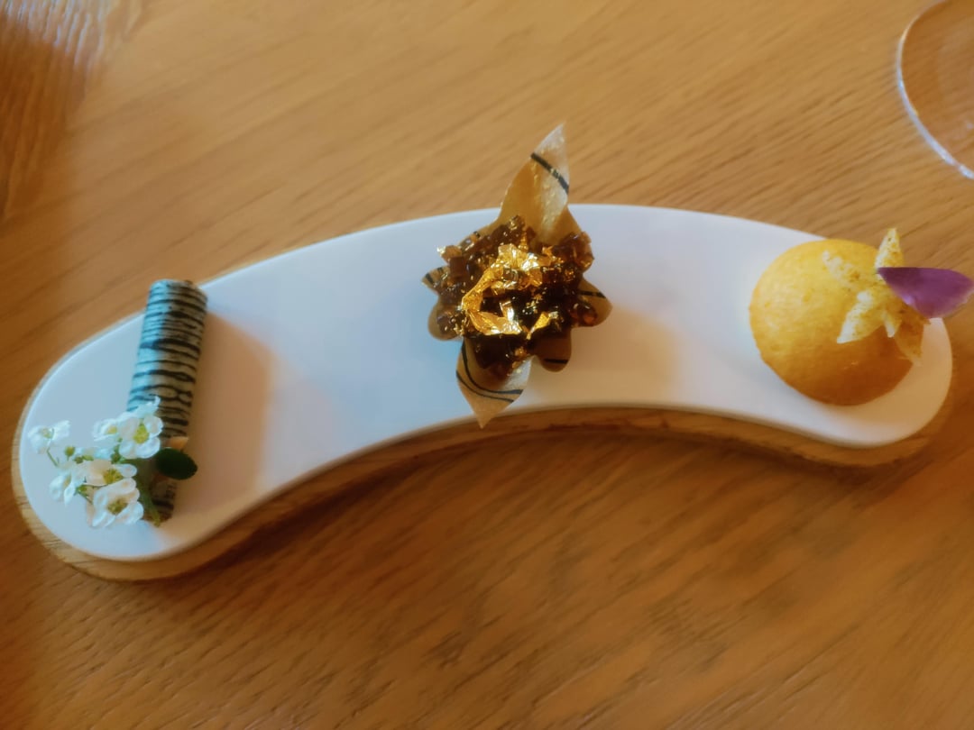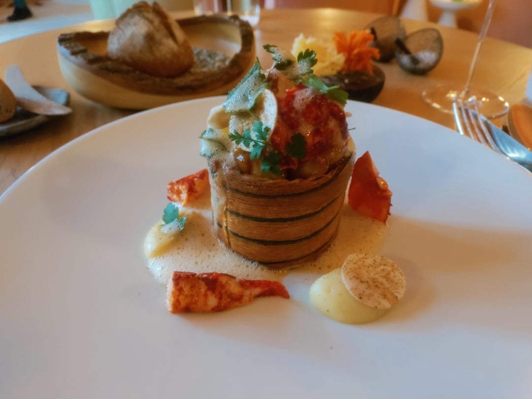 I only had the one glass of wine after the kir royale, which was a Hungarian white packed with herbaceous notes. It paired well with the main Vol-au-vent dish, which has a centrepiece of sweetbreads and mushrooms with chicken stock enclosed by pastry and lobster meat and turnip puree on the outside. If judging purely by the meat, mushrooms and pastry, I’d have said this is a dish you might find within a really good bistro, but the lobster and other elements really elevated it. The lobster itself was perfect, and it paired well with the turnip puree (which was excellent in its own right). I was slightly worried that, after cutting into the pastry and the sauce leaking out, the flavours might become confused, but this wasn’t the case. A really enjoyable and surprisingly filling dish, delicious.