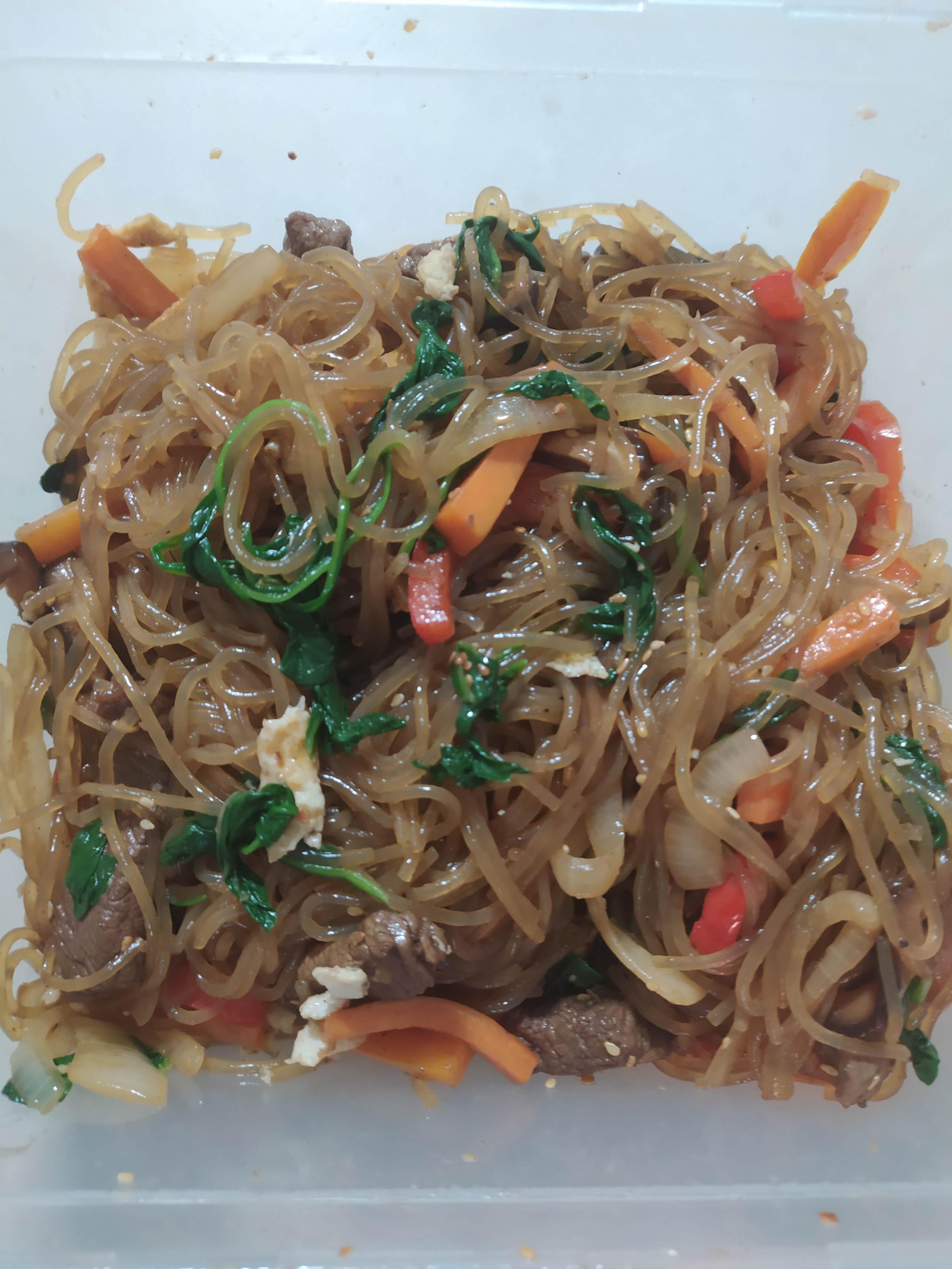 Looks good. Japchae always tastes better reheated.